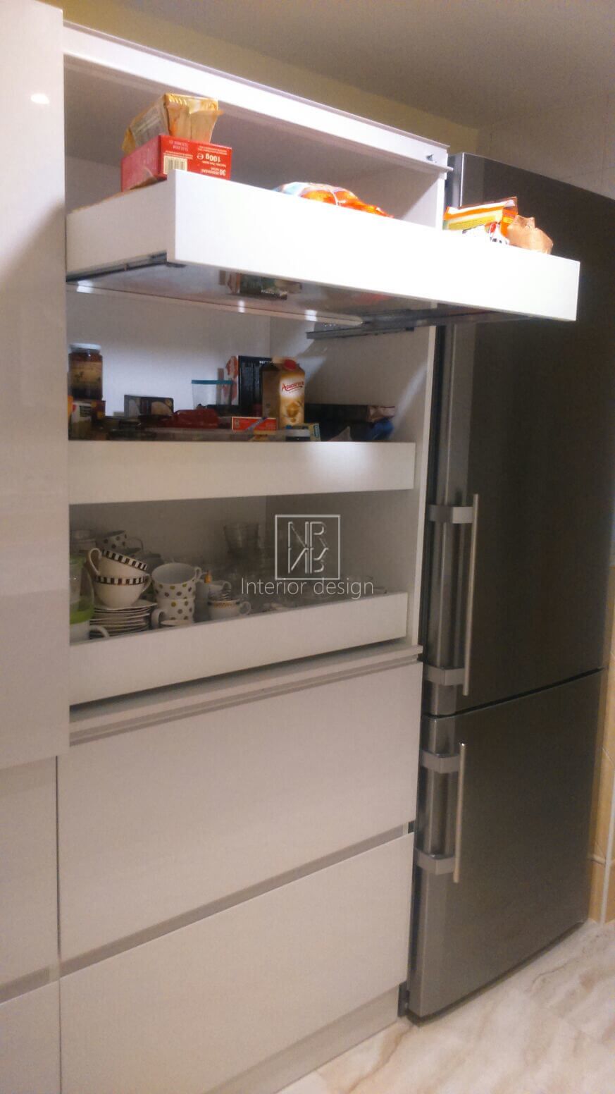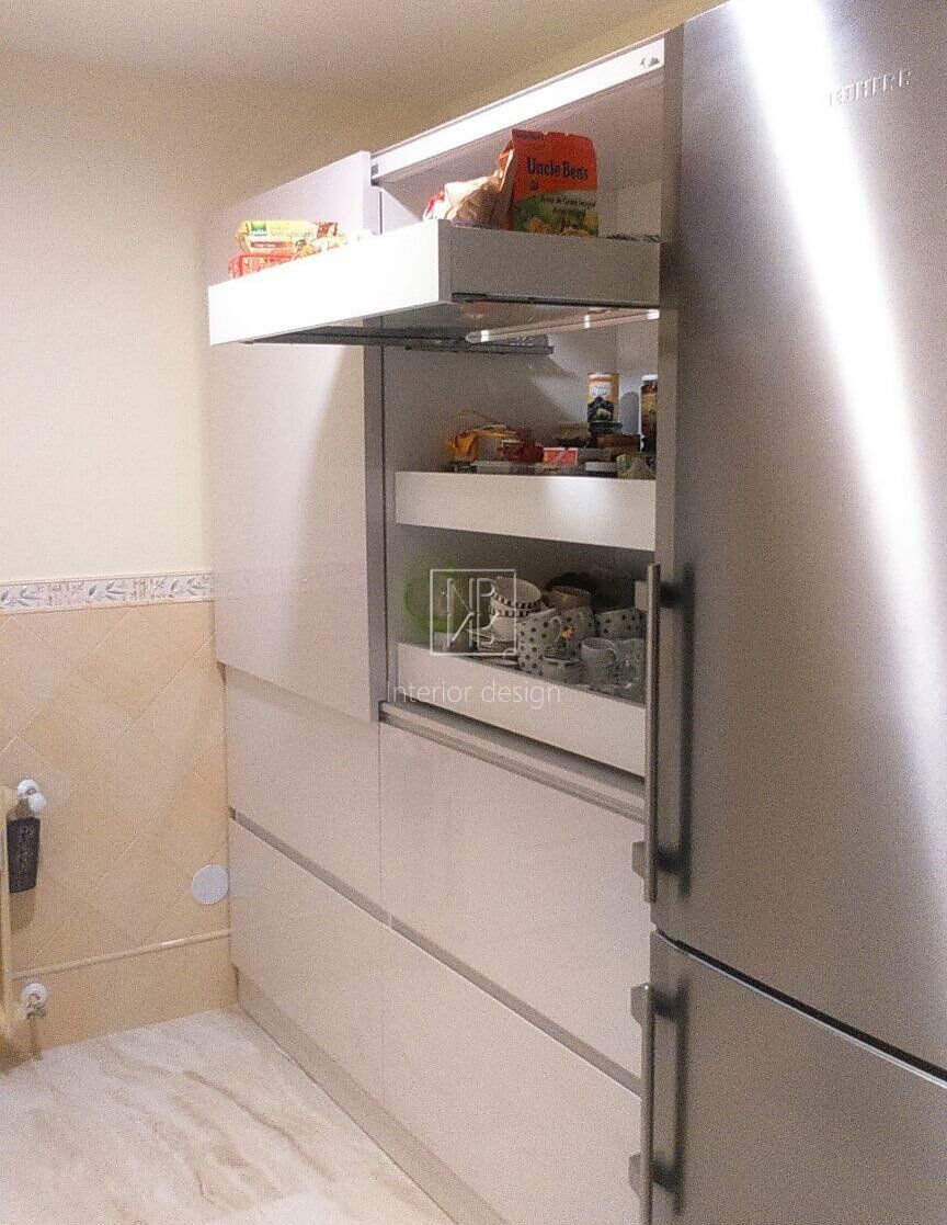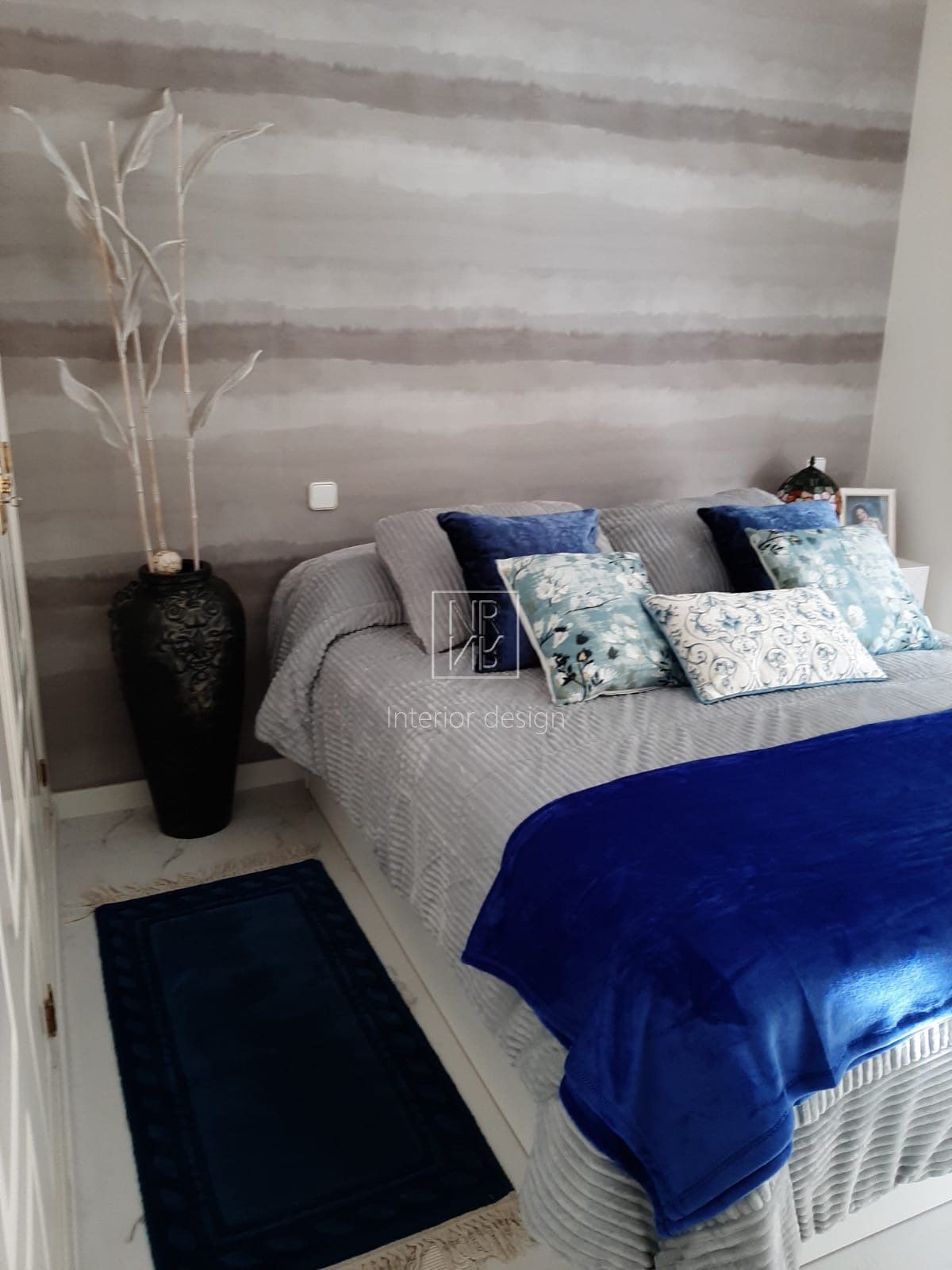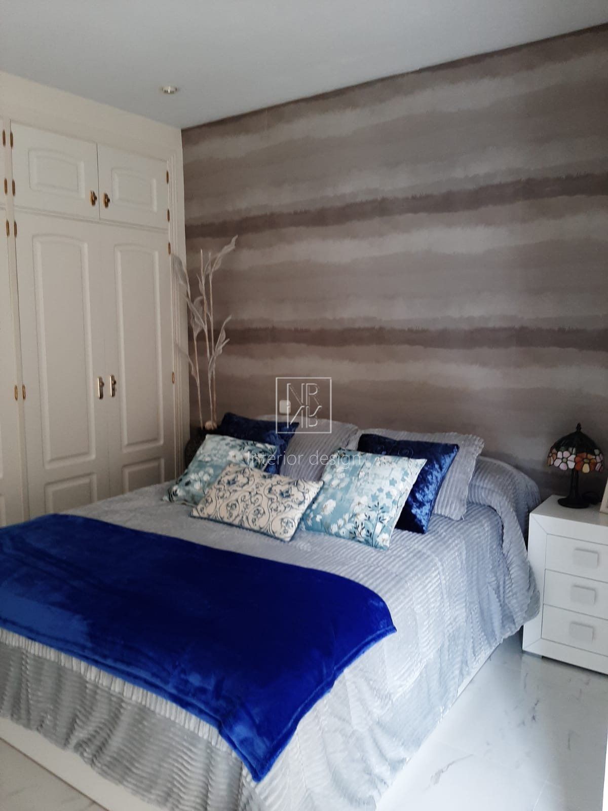 Comencem canviant la distribució dels mobles de cuina i realitzem un disseny de mobiliari en laca blanca alta brillantor per donar-li més llum i amplitud a l'espai, mentrestant es va escollir un ceràmic marbrejat per a tot el terra de la casa i es va aixecar el parquet per col·locar el terra nou. Especialment cal destacar de la cuina l'absència de tirador, així com la fabricació en exclusiva de la nostra firma amb el disseny dels mobles com el moble de porta corredissa i amb 1 calaix de fons de vidre. L'ús de materials amb última tecnologia en ferratges i el taulell de cuina li va donar aquest toc contemporani que estàvem buscant. Als dormitoris ressaltem 2 parets amb paper tapís per destacar aquestes zones i canviem el mobiliari. Com al projecte anterior, la propietària va quedar molt satisfeta amb el resultat.