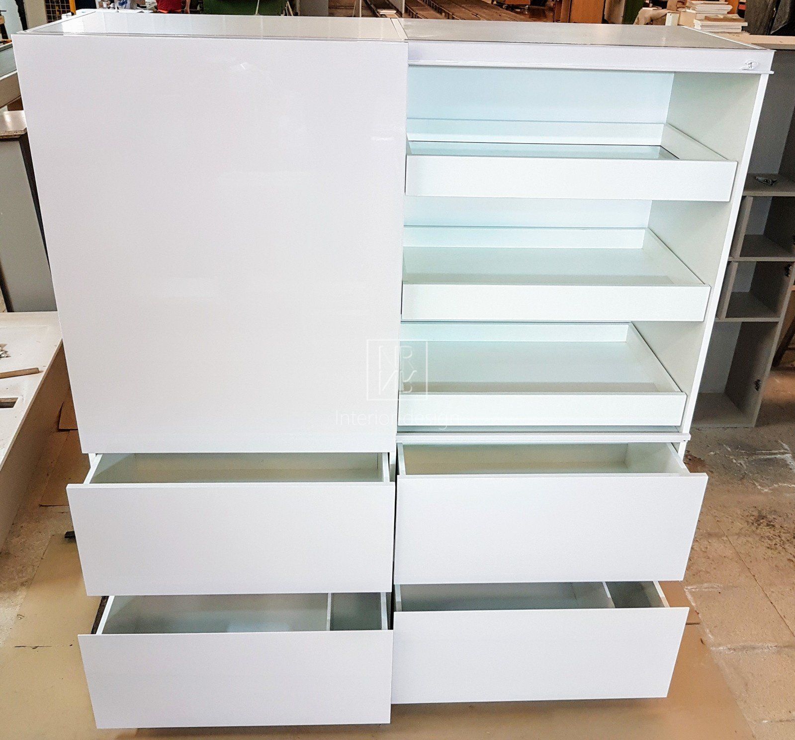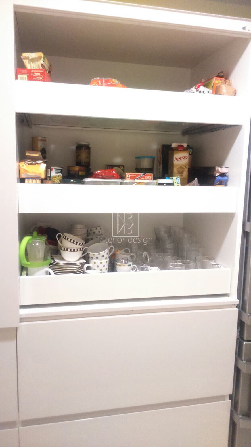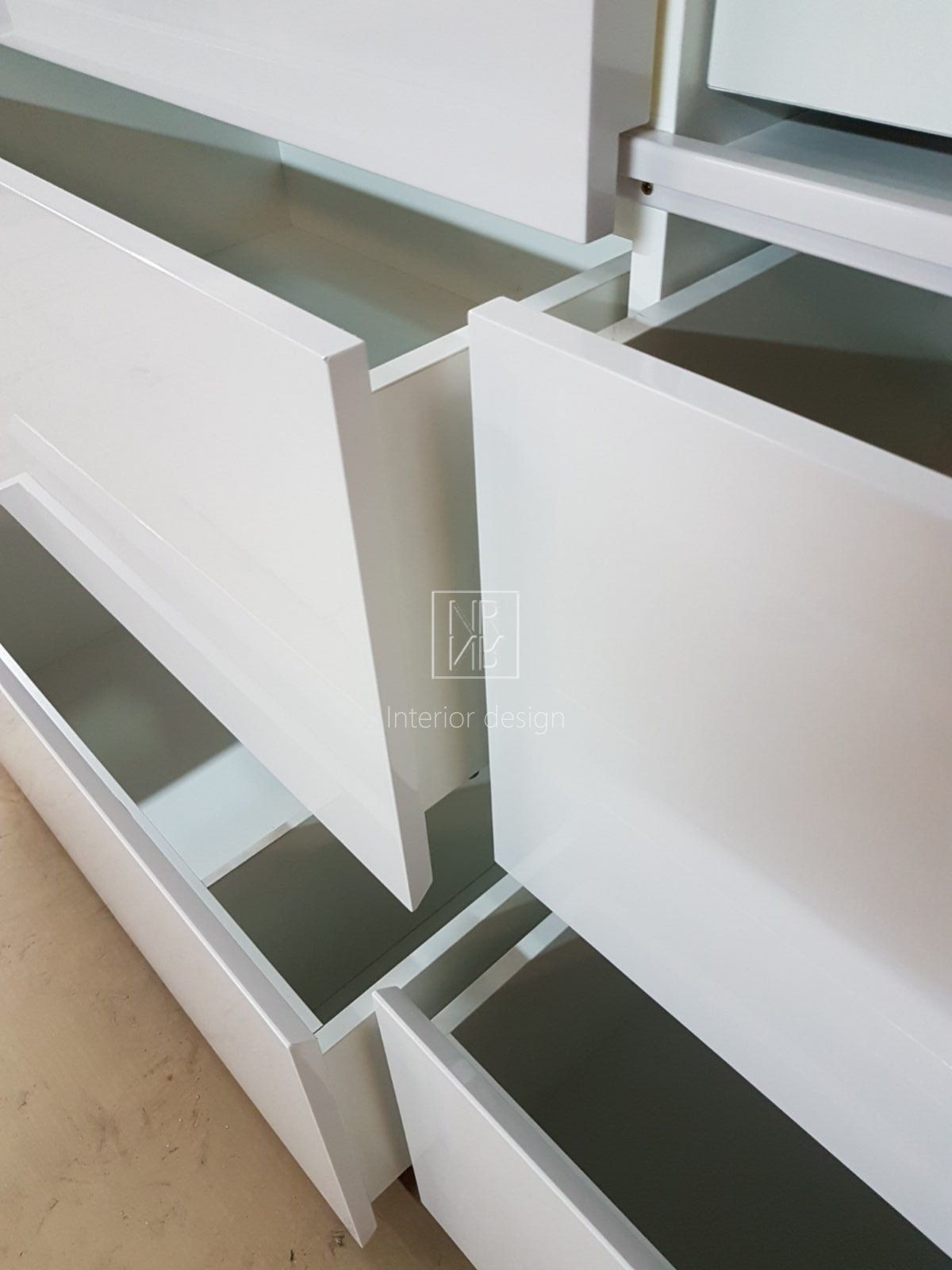 Comencem canviant la distribució dels mobles de cuina i realitzem un disseny de mobiliari en laca blanca alta brillantor per donar-li més llum i amplitud a l'espai, mentrestant es va escollir un ceràmic marbrejat per a tot el terra de la casa i es va aixecar el parquet per col·locar el terra nou. Especialment cal destacar de la cuina l'absència de tirador, així com la fabricació en exclusiva de la nostra firma amb el disseny dels mobles com el moble de porta corredissa i amb 1 calaix de fons de vidre. L'ús de materials amb última tecnologia en ferratges i el taulell de cuina li va donar aquest toc contemporani que estàvem buscant. Als dormitoris ressaltem 2 parets amb paper tapís per destacar aquestes zones i canviem el mobiliari. Com al projecte anterior, la propietària va quedar molt satisfeta amb el resultat.