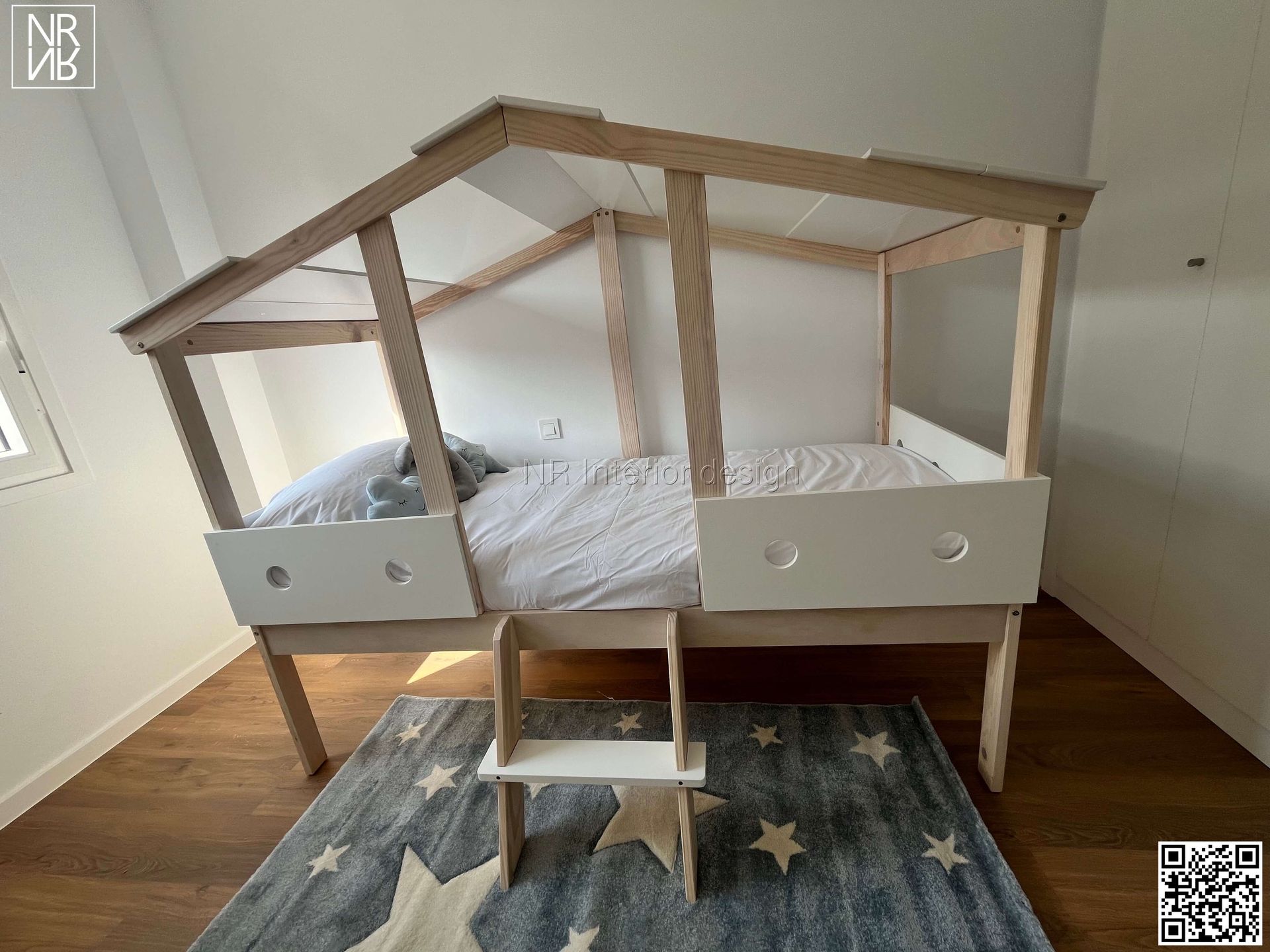 The children's bedroom in blue and white tones with the house bed has a special charm.