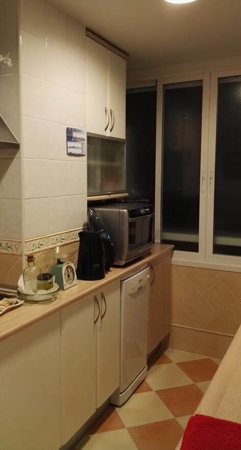 We started by changing the layout of the kitchen cabinets and designed a high-gloss white lacquer cabinet to give the space more light and spaciousness. Meanwhile, we chose marbled ceramic tile for the entire floor, and the parquet flooring was removed to install the new flooring. Particularly noteworthy in the kitchen is the absence of handles, as well as the exclusive manufacturing of our cabinetry, including the sliding-door cabinet with one glass-backed drawer. The use of state-of-the-art hardware and the kitchen countertop gave it the contemporary touch we were looking for. In the bedrooms, we highlighted two walls with wallpaper to highlight those areas and changed the cabinetry. As in the previous project, the owner was very satisfied with the result.