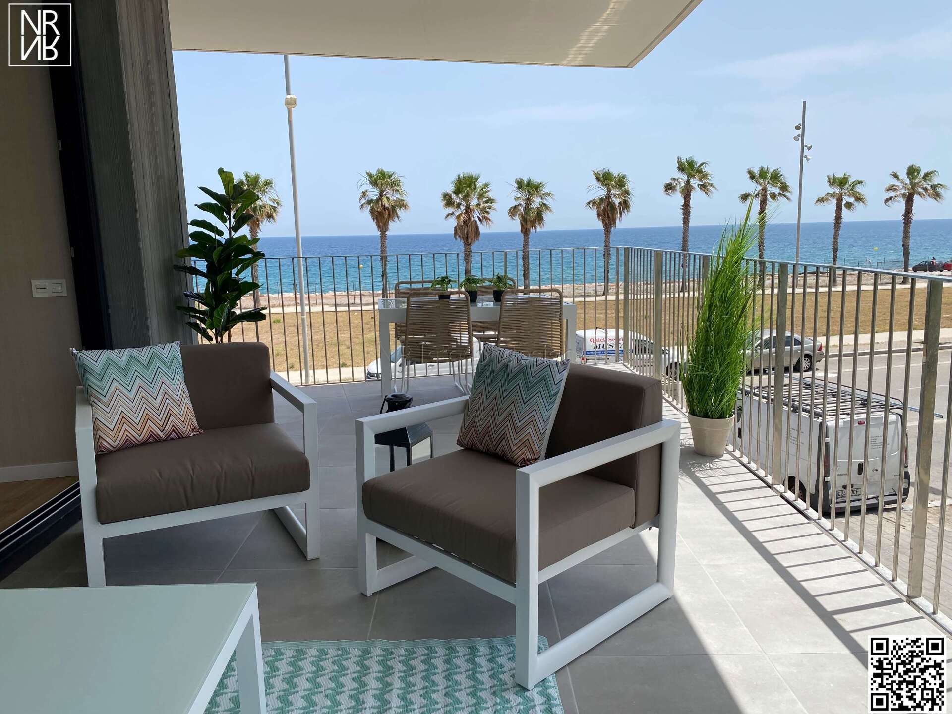 This spacious four-bedroom apartment with sea views is designed to reflect the beach lifestyle, along with the warmth and relaxation of the sea. Natural tones like beach sand, turquoise, and blues like sea water, along with natural oak wood, harmonize this spacious apartment, introducing the views through the large windows. The large terrace blends the space with the outdoors and invites us to find peace and immerse ourselves in the harmony this environment always conveys.