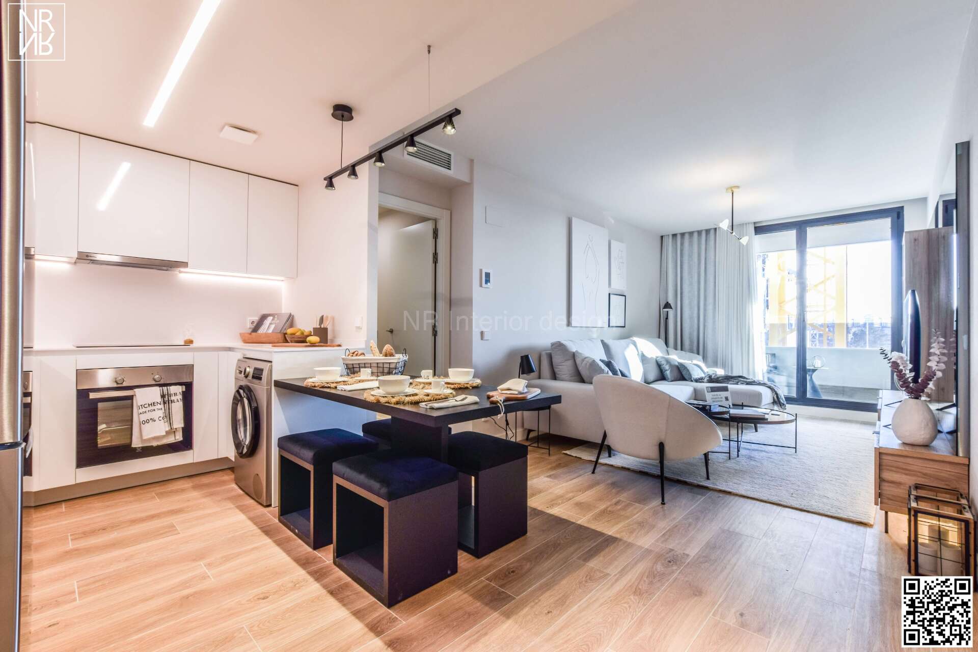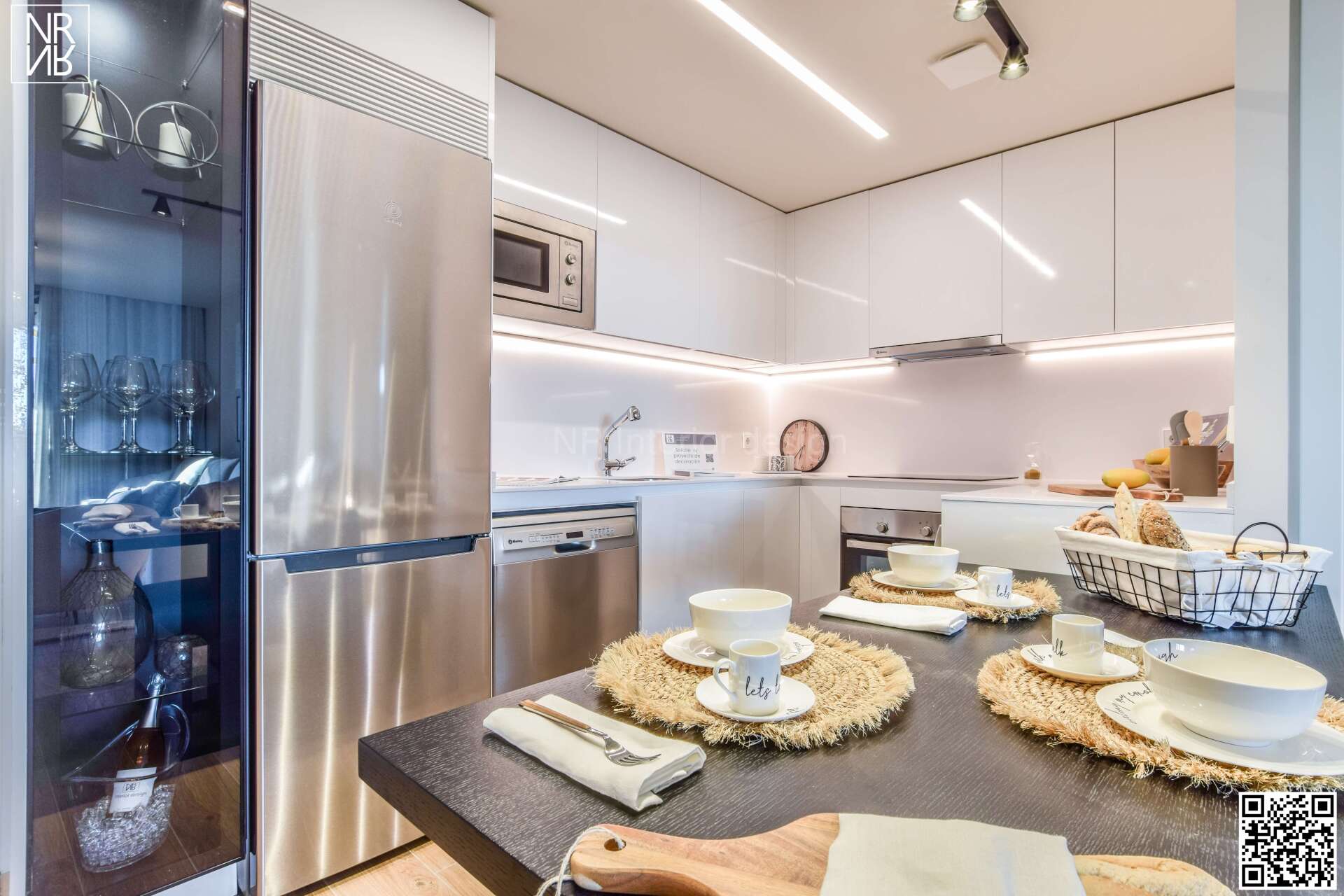 Spectacular two-bedroom apartment located in a Madrid skyscraper. We decided to opt for a modern and elegant urban design, combining mirror effects with straight-line furniture and backlighting to create more visually appealing spaces and amplify the rooms. The final result provides a seamless blend of space, creating an interior where every element fits together perfectly.