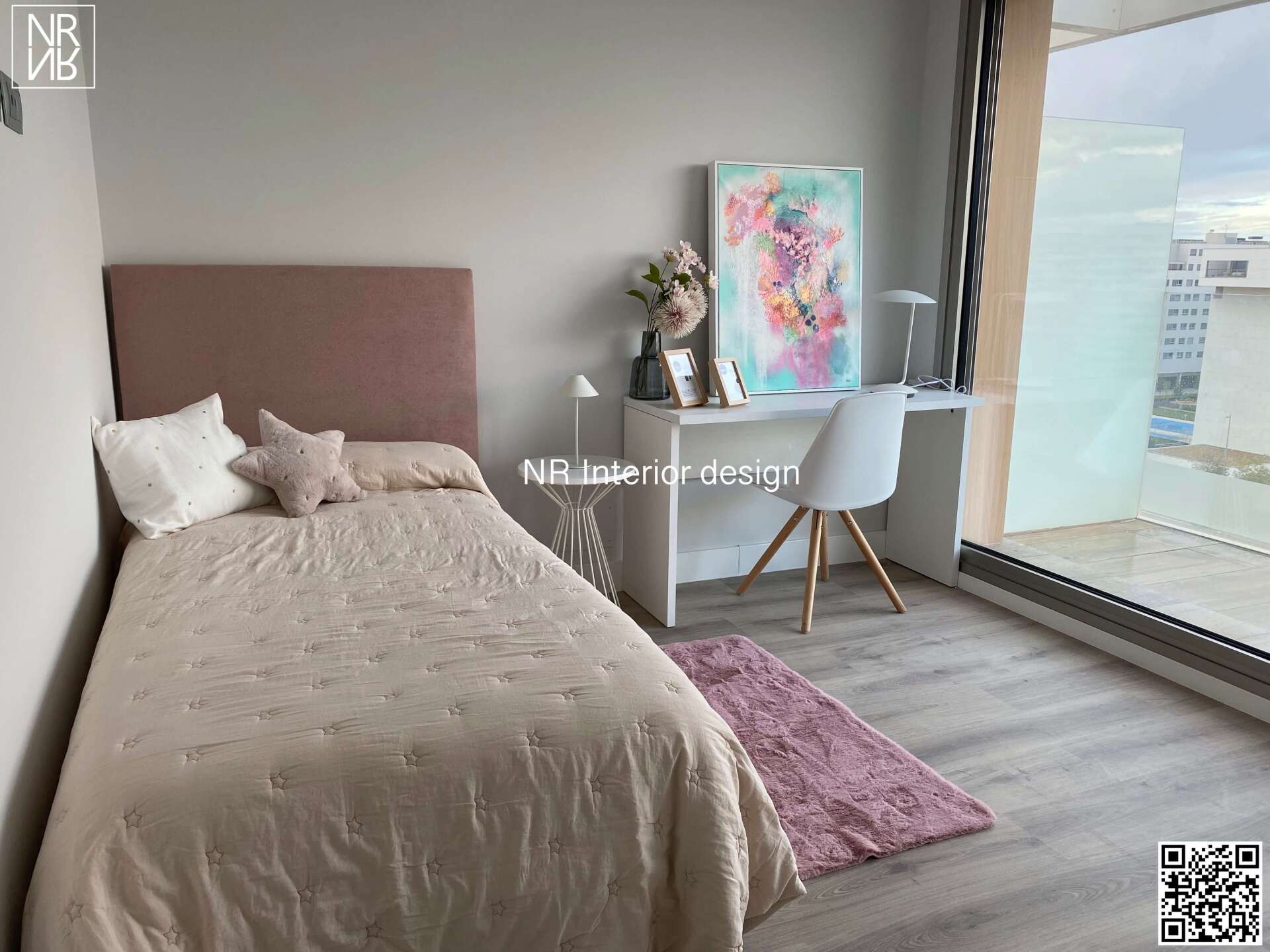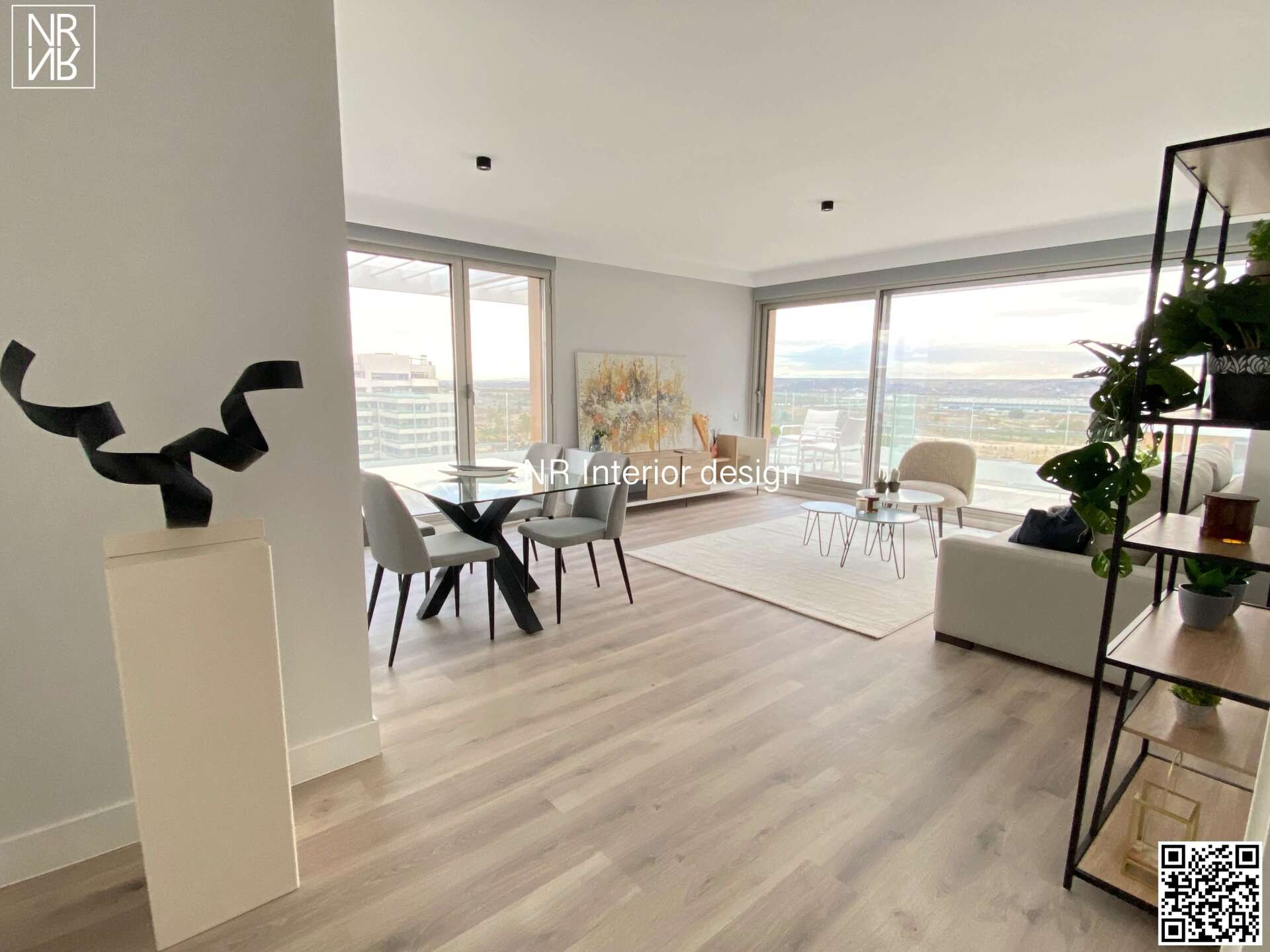 On this fantastic occasion, we are pleased to present a special design for a penthouse valued at €1 million. We find a symmetrical layout with a square living room and a perimeter terrace. The decor is based on natural woods with gray tones and touches of color provided by splendid works of art. For the terrace, we chose designer furniture finished in white epoxy aluminum with water-repellent upholstery prepared for rain. The result is a pleasant, spacious property with a terrace where you can enjoy the incredible sunsets that this area of Madrid offers.