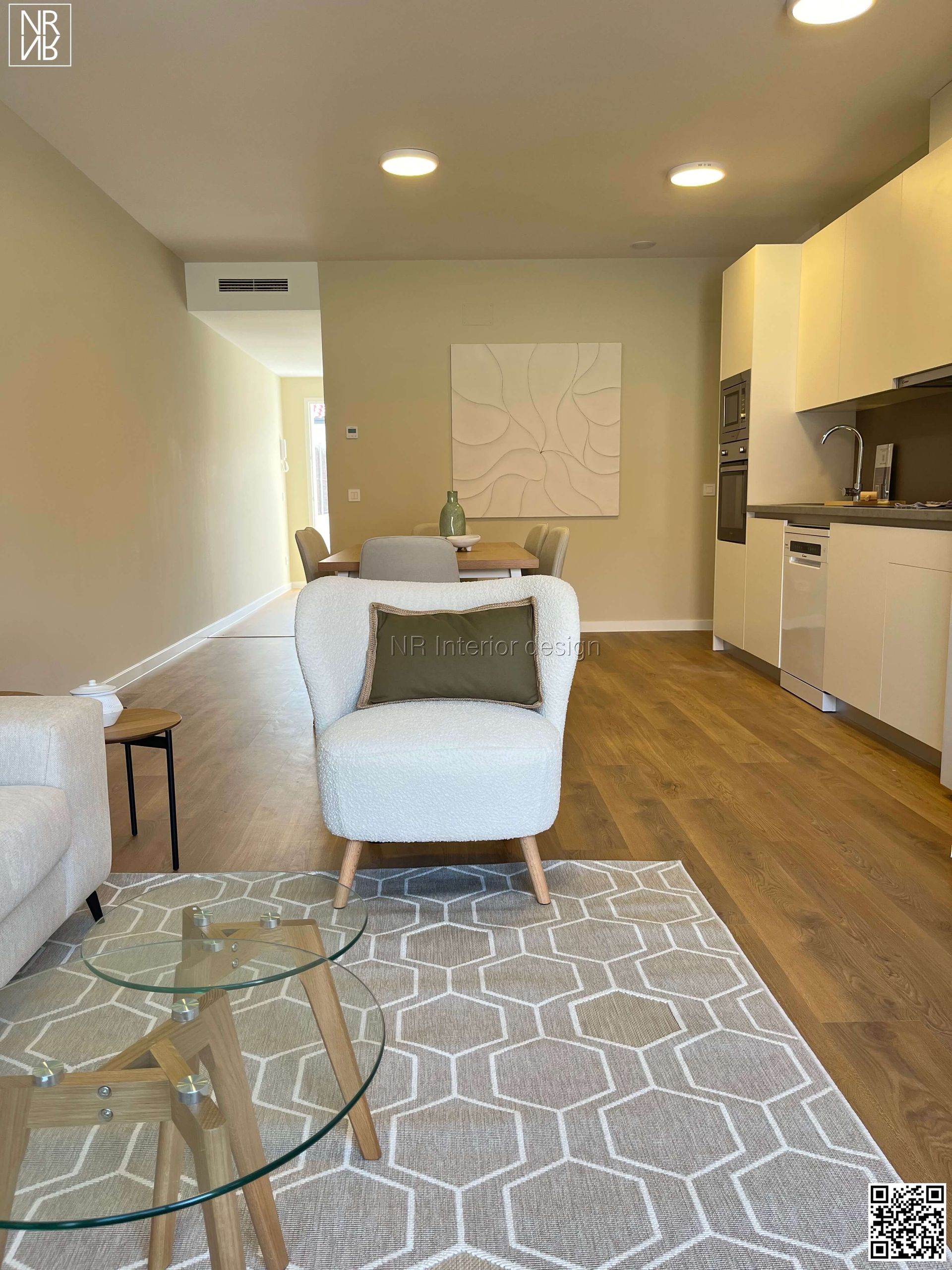 Mobilier, luminaires, rideaux et décoration.