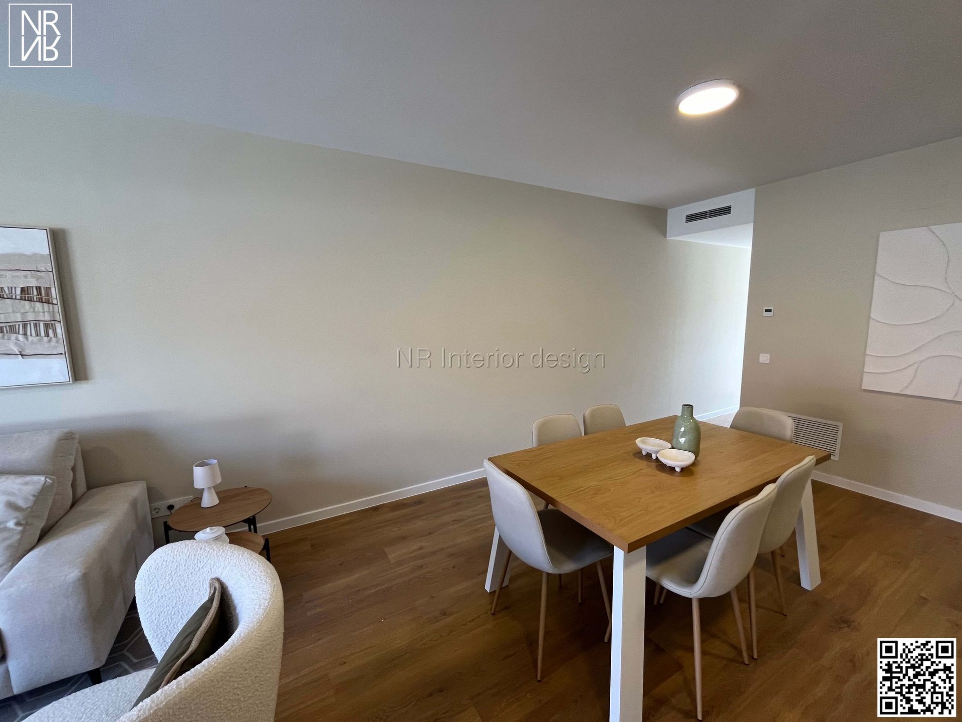 Sa magnifique terrasse agrandit l'espace salon/salle à manger. Les tons et textures blanc cassé des tissus nous conduisent vers des espaces qui nous embrassent.
