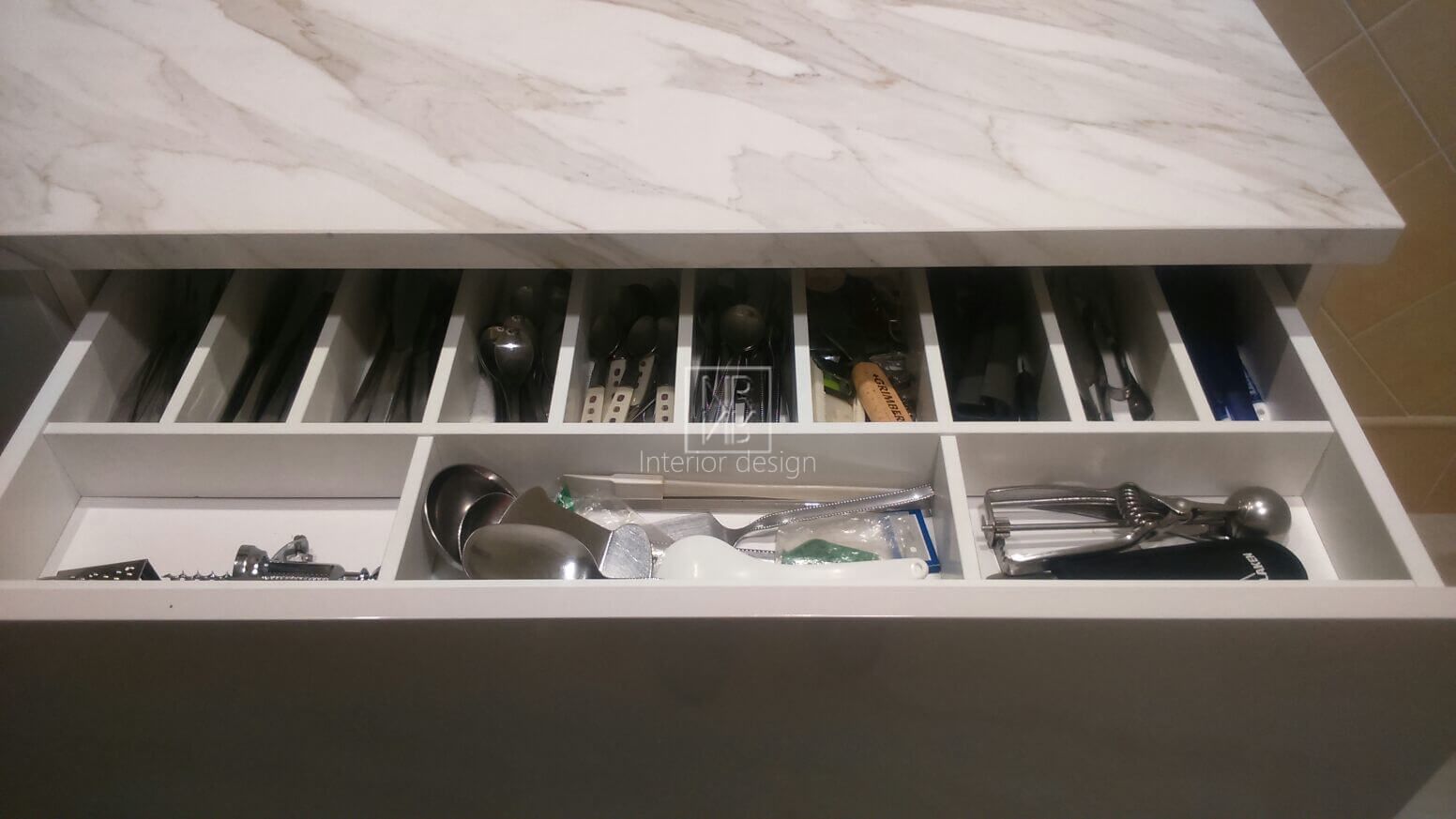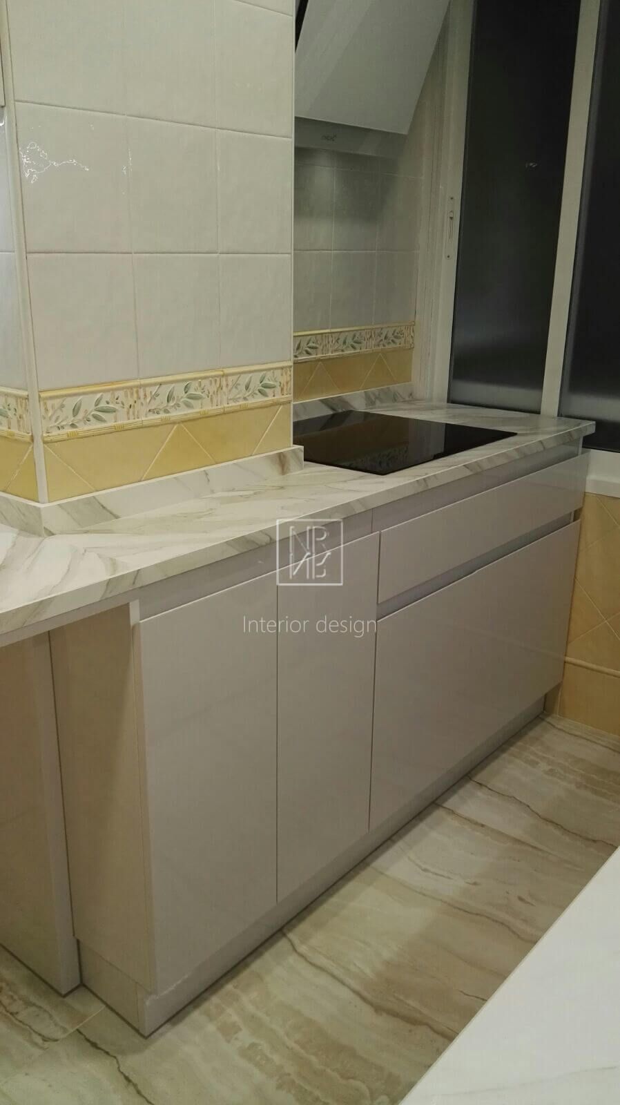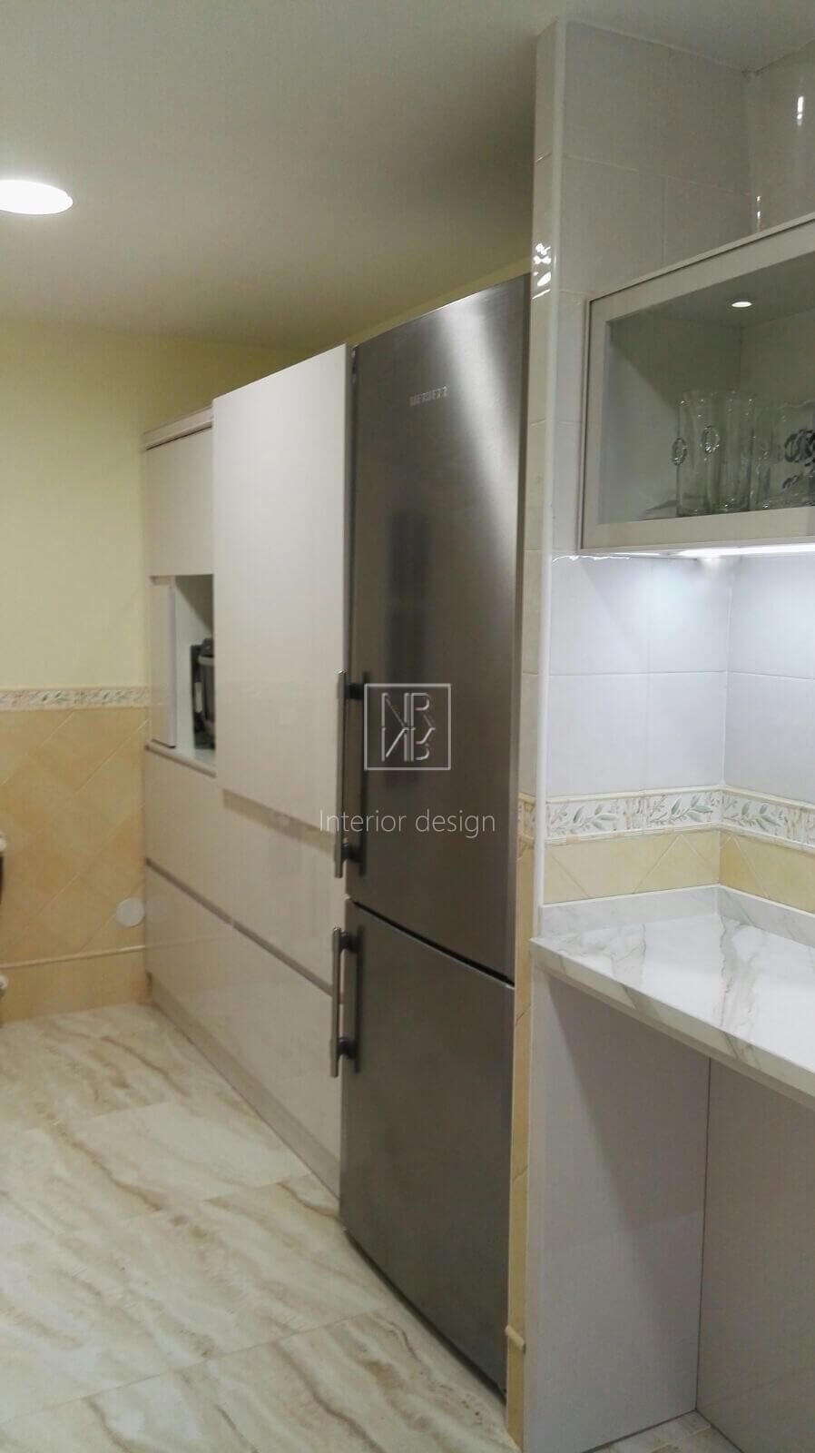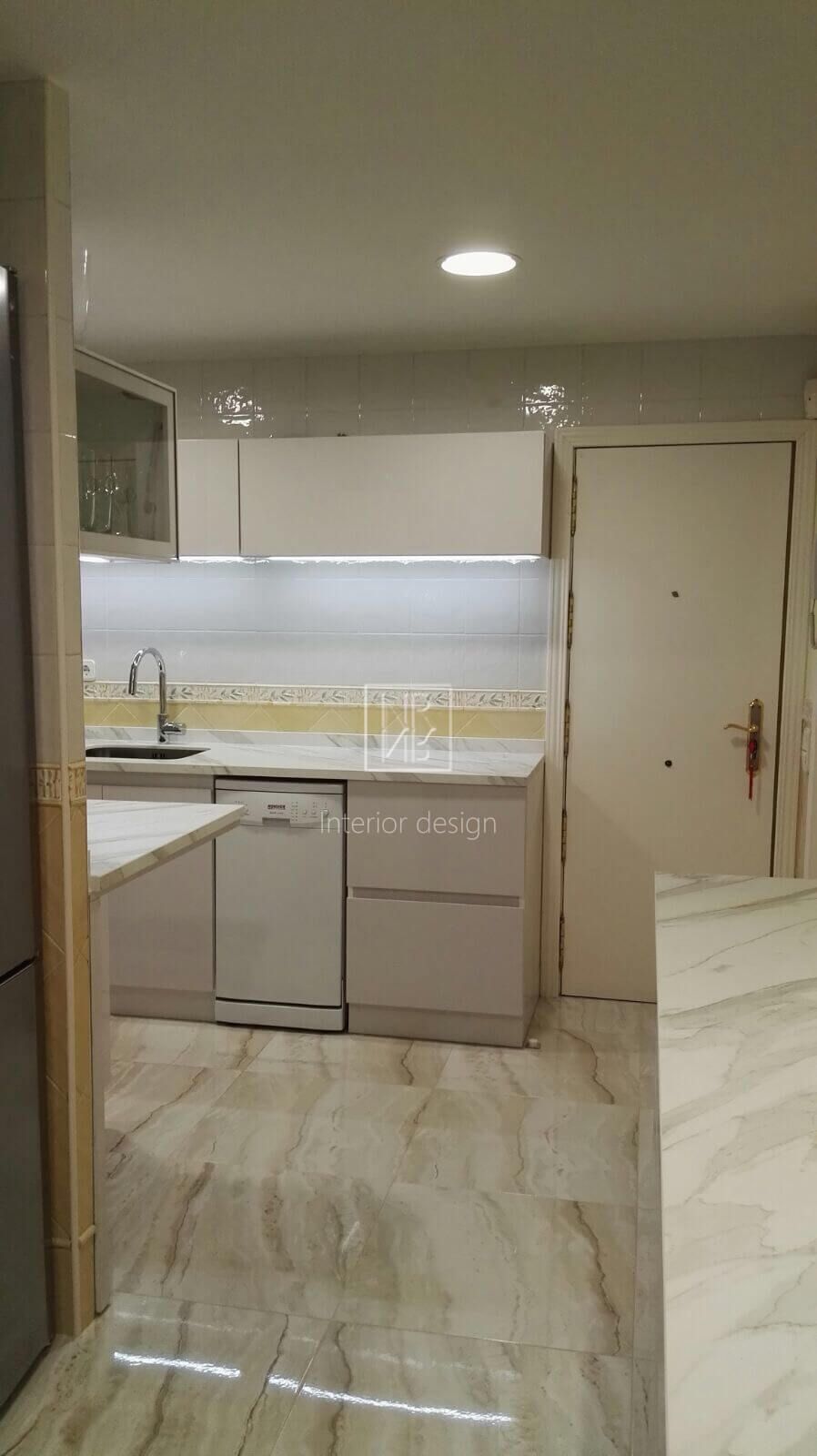 Nous avons commencé par modifier la disposition des armoires de cuisine et avons conçu une armoire laquée blanche brillante pour donner à l'espace plus de lumière et d'espace. Entre-temps, un carrelage en céramique marbré a été choisi pour tout le sol de la maison, et le parquet a été retiré pour installer le nouveau revêtement de sol. Dans la cuisine, l'absence de poignées ainsi que la fabrication exclusive de nos meubles design, comme le meuble à portes coulissantes et un tiroir à fond en verre, sont particulièrement remarquables. L'utilisation de matériaux de pointe dans la quincaillerie et le comptoir de cuisine lui a donné la touche contemporaine que nous recherchions. Dans les chambres, nous avons mis en valeur deux murs avec du papier peint pour mettre en valeur ces zones et avons changé le mobilier. Comme dans le projet précédent, le propriétaire a été très satisfait du résultat.