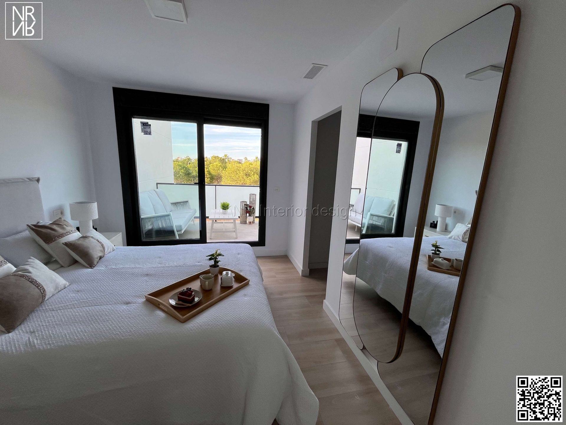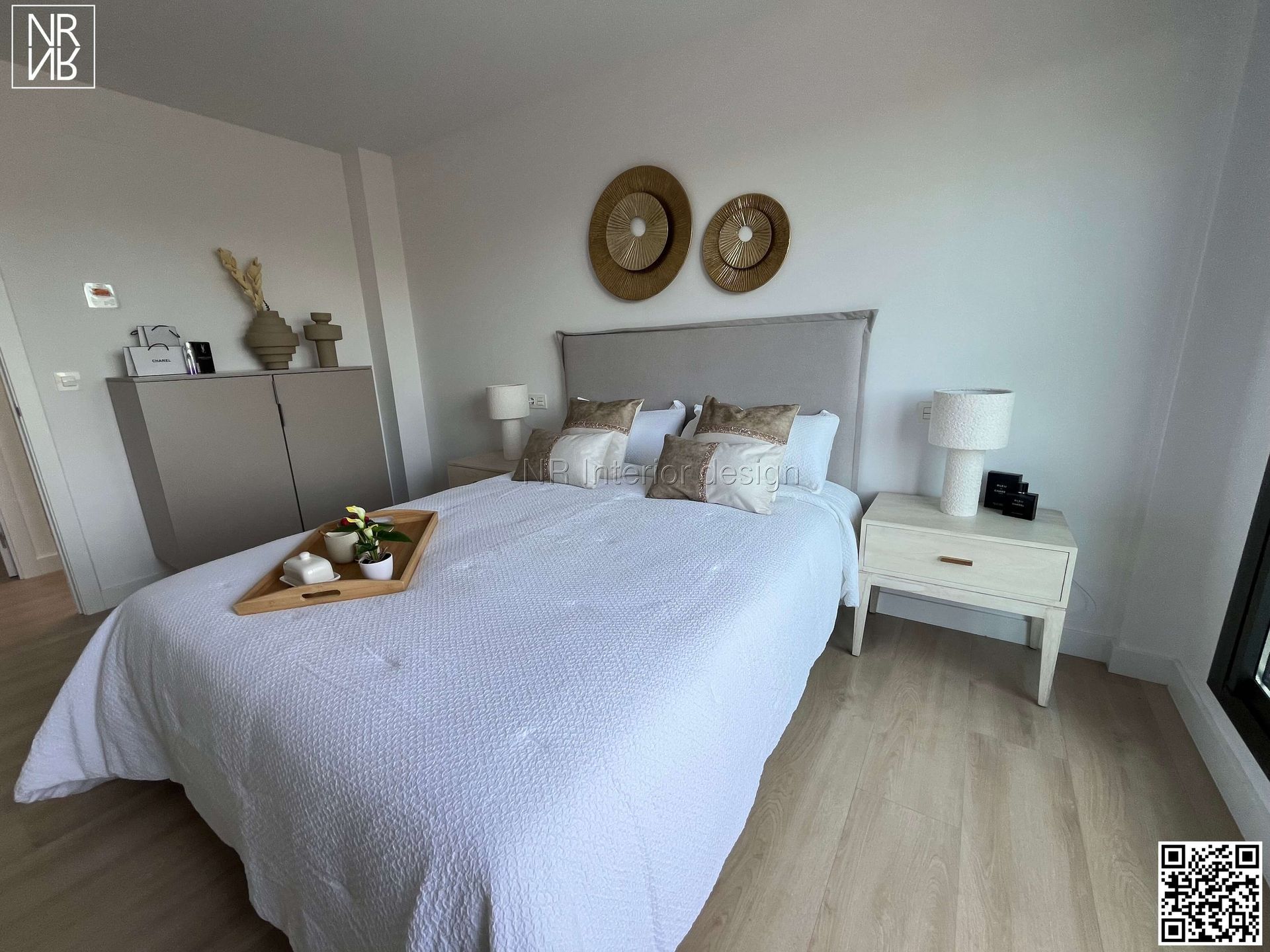 La chambre principale, avec ses grandes tables de chevet en bois mariné et ses lampes imposantes en peau de mouton, magnifie la pièce. La commode à portes, qui fait office d'armoire supplémentaire, est idéale pour ranger la literie et les serviettes. Au pied du lit se trouve un grand miroir en bronze, divisé en trois parties, qui amplifie et habille encore plus la chambre.