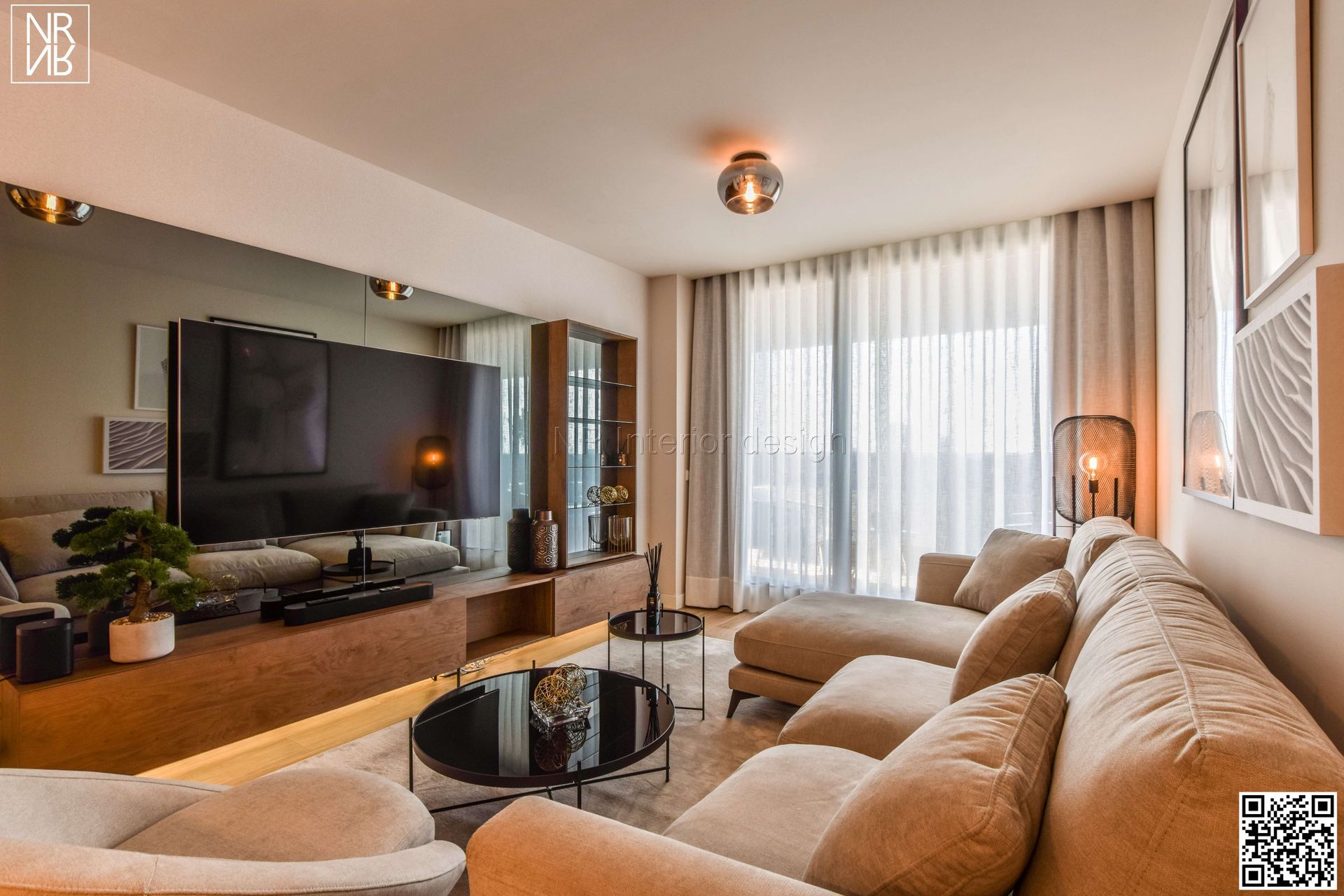 Aménagement intérieur avec meubles, rideaux, papier peint et éléments décoratifs sur mesure.