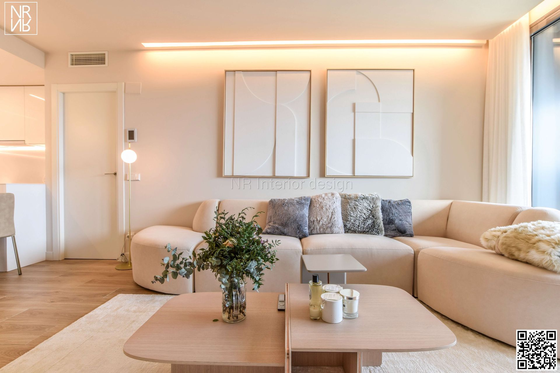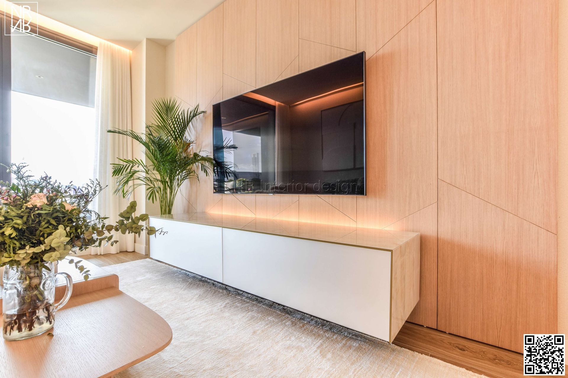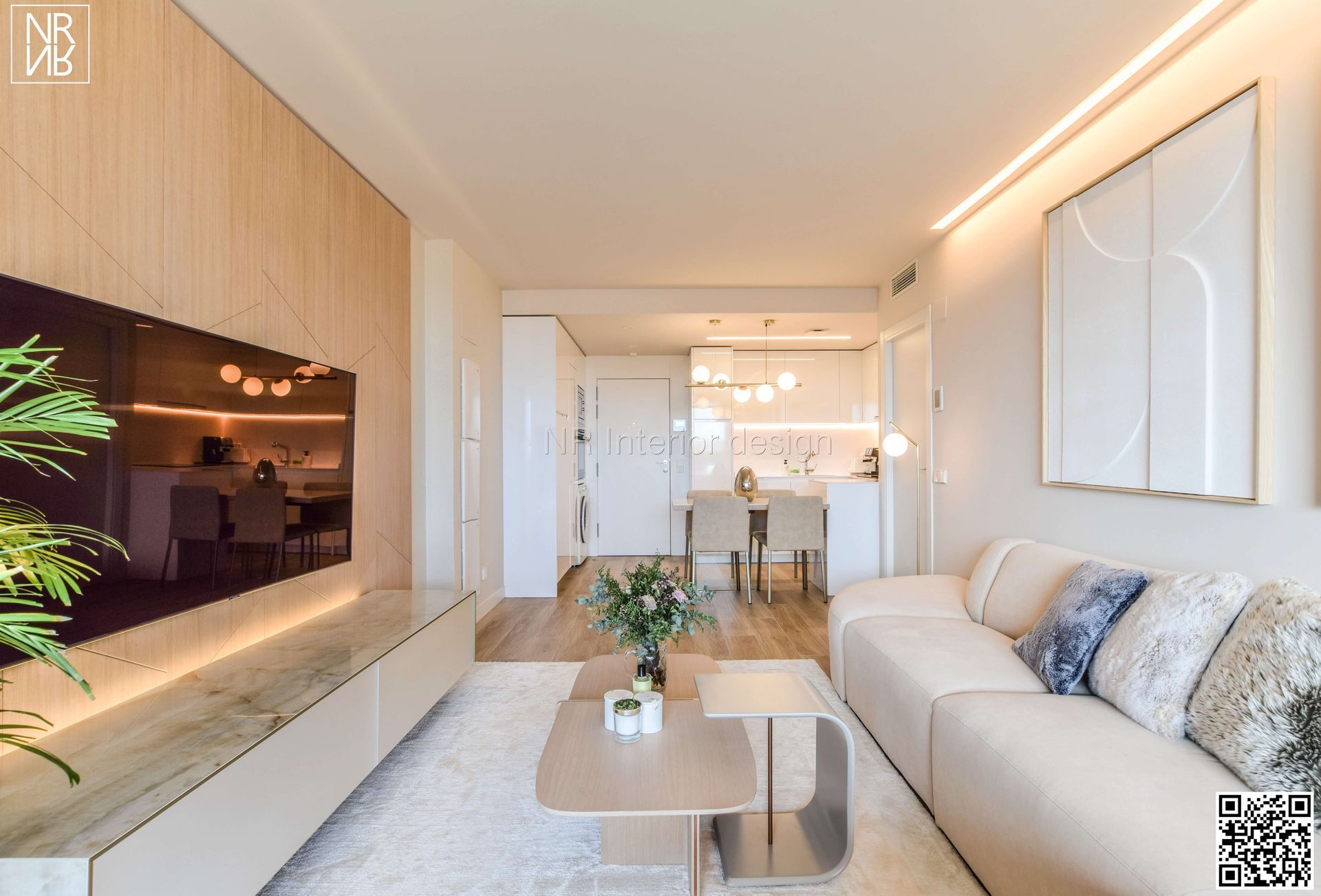 Design et luxe convergent dans ce projet. Nous trouvons des designs spéciaux réalisés sur mesure. Dans le salon, nous avons fabriqué un panneau du sol au plafond en chêne clair, avec un meuble TV flottant en porcelaine italienne. Associés au canapé fait main au design unique de notre studio, ils embellissent la pièce, offrant harmonie, confort et design.