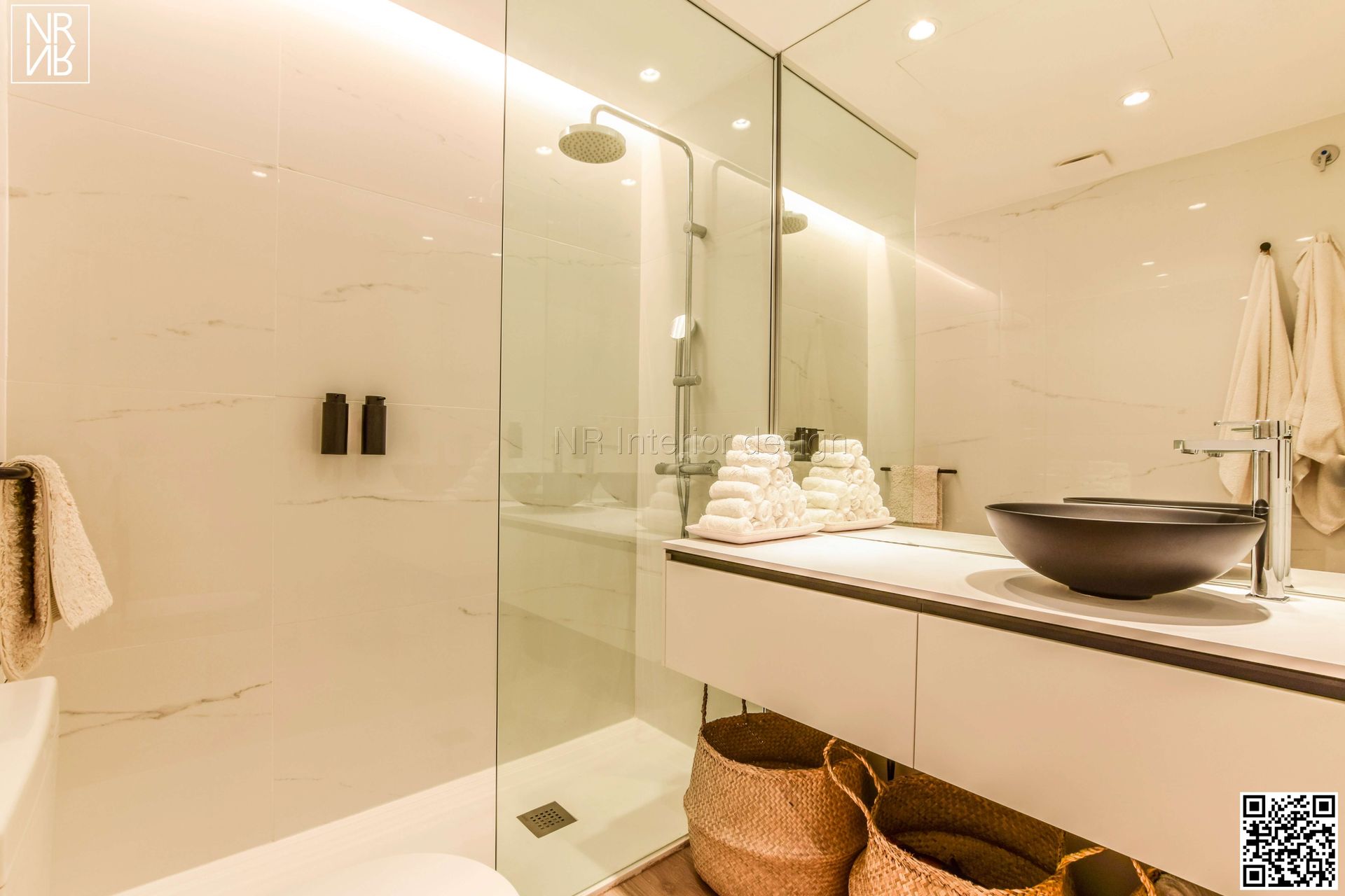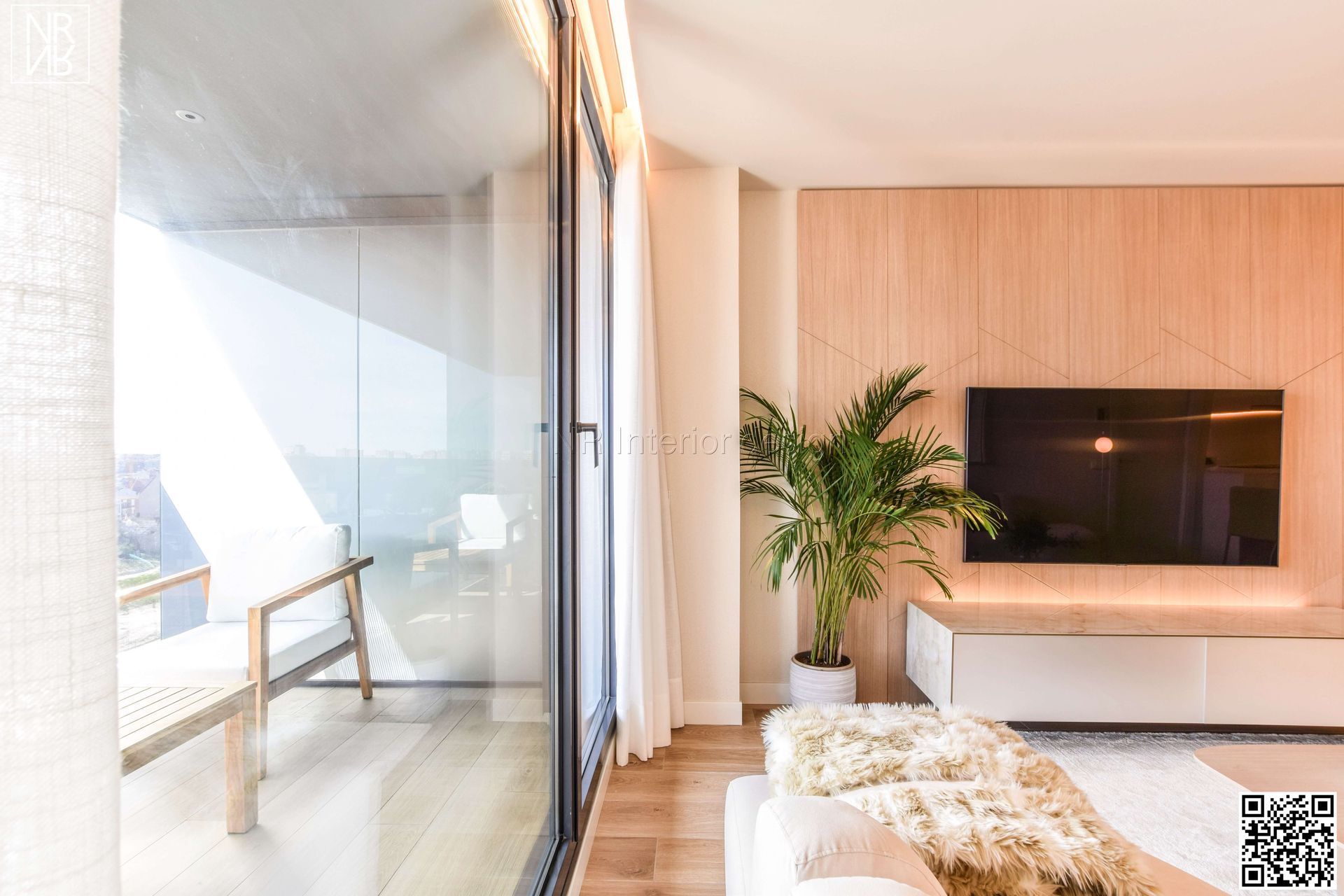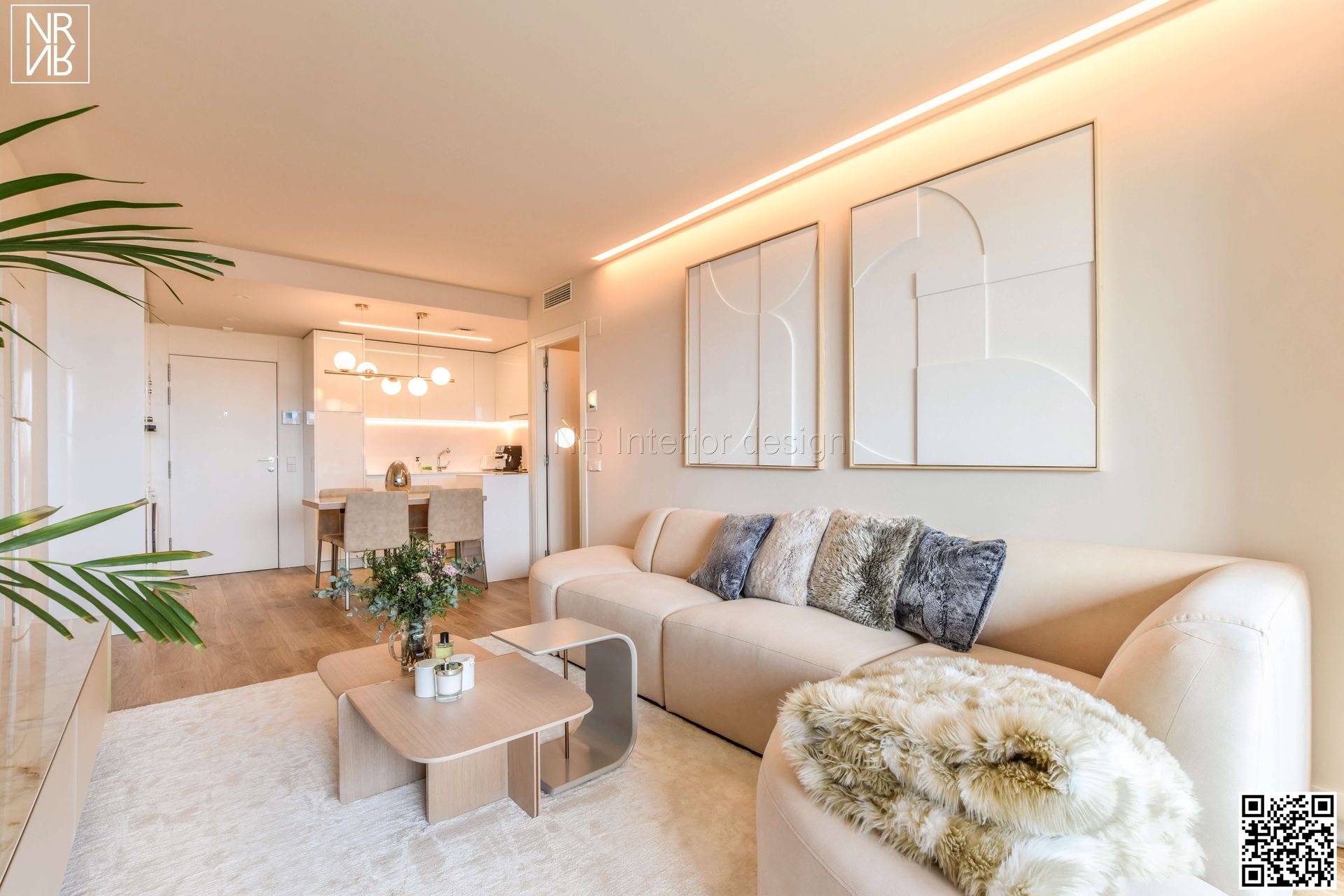 Design et luxe convergent dans ce projet. Nous trouvons des designs spéciaux réalisés sur mesure. Dans le salon, nous avons fabriqué un panneau du sol au plafond en chêne clair, avec un meuble TV flottant en porcelaine italienne. Associés au canapé fait main au design unique de notre studio, ils embellissent la pièce, offrant harmonie, confort et design.
