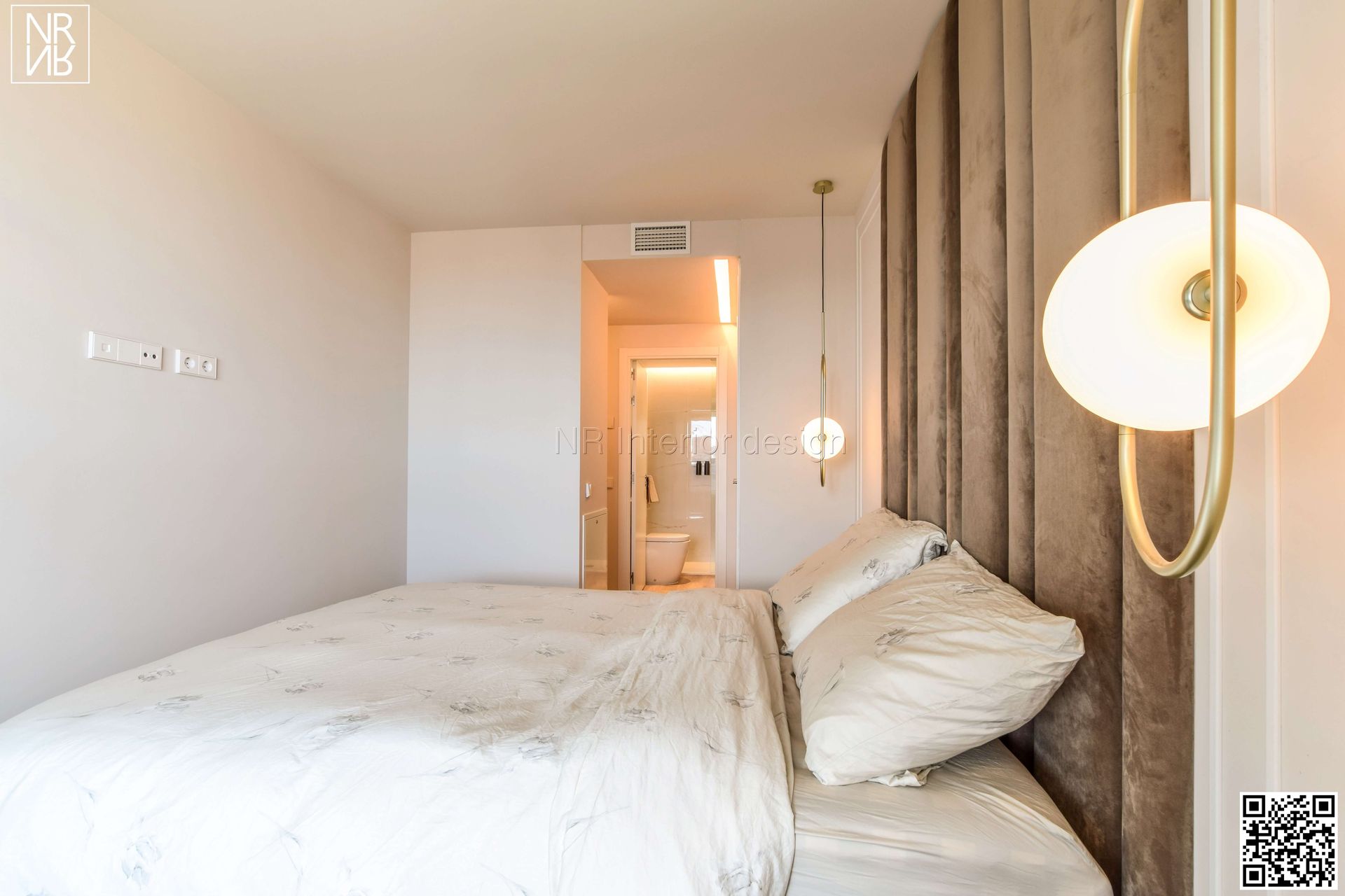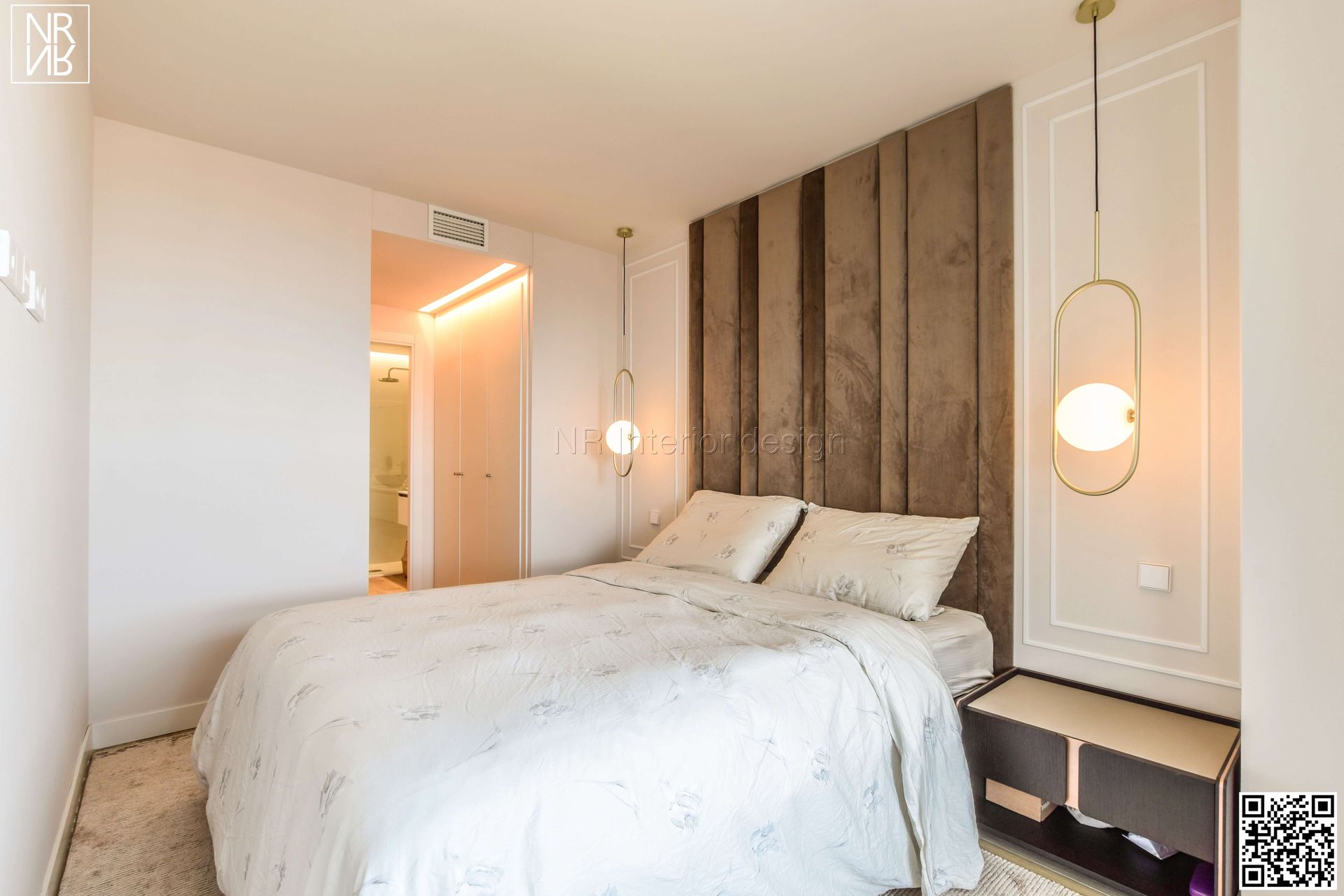 Dans la chambre principale, un espace très élégant est conçu. Sur le mur principal, nous avons conçu des panneaux des deux côtés et au centre une tête de lit jusqu'au plafondrecouvert de velours. Les tables de nuit sont en bois de chêne avec le dessus recouvert de cuir. L'éclairage est choisi dans un design suspendu pour apporter un équilibre à la composition globale.