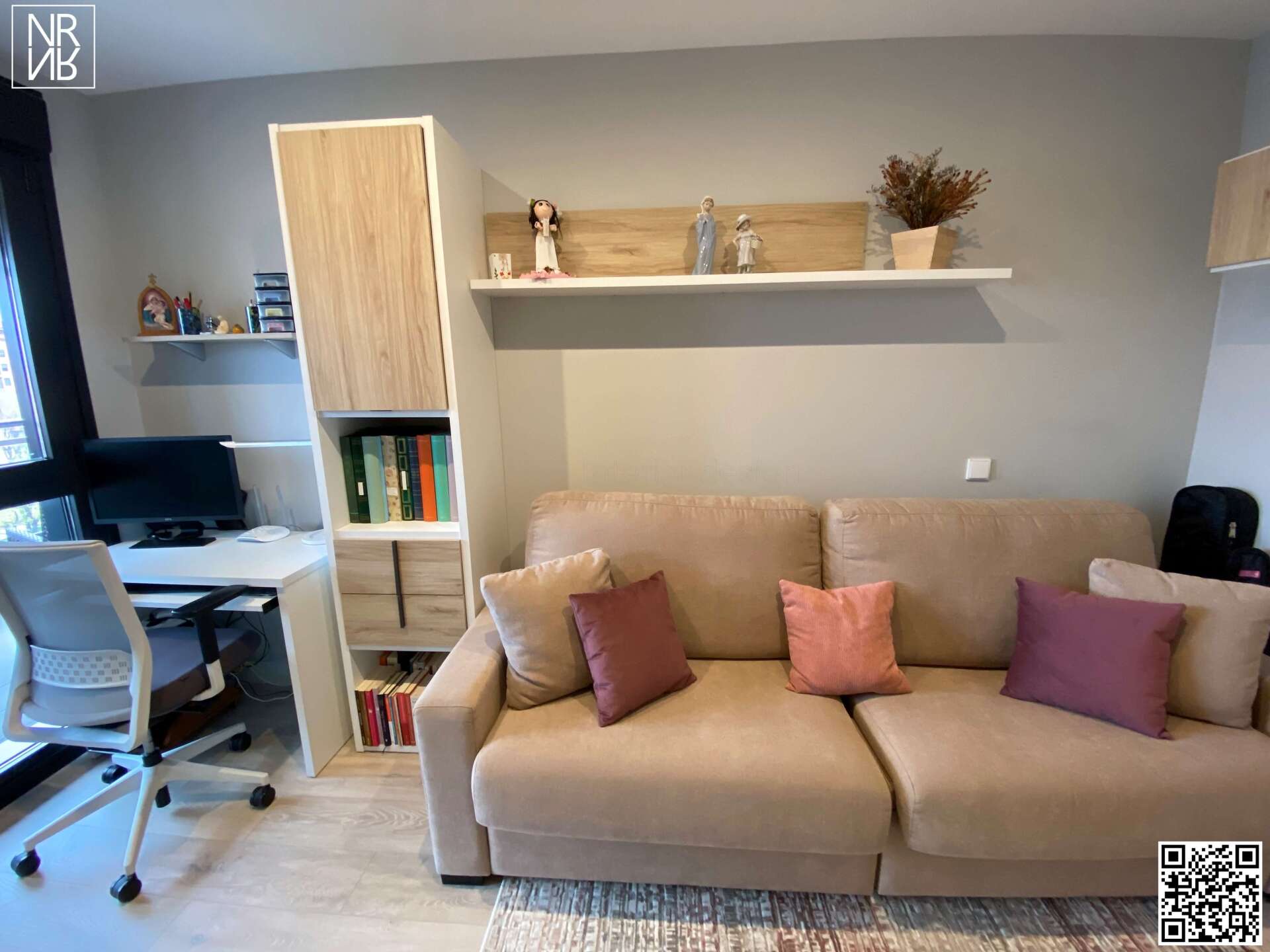 Muebles custom, despacho, terraza, iluminación, papel y cuarterones en paredes.