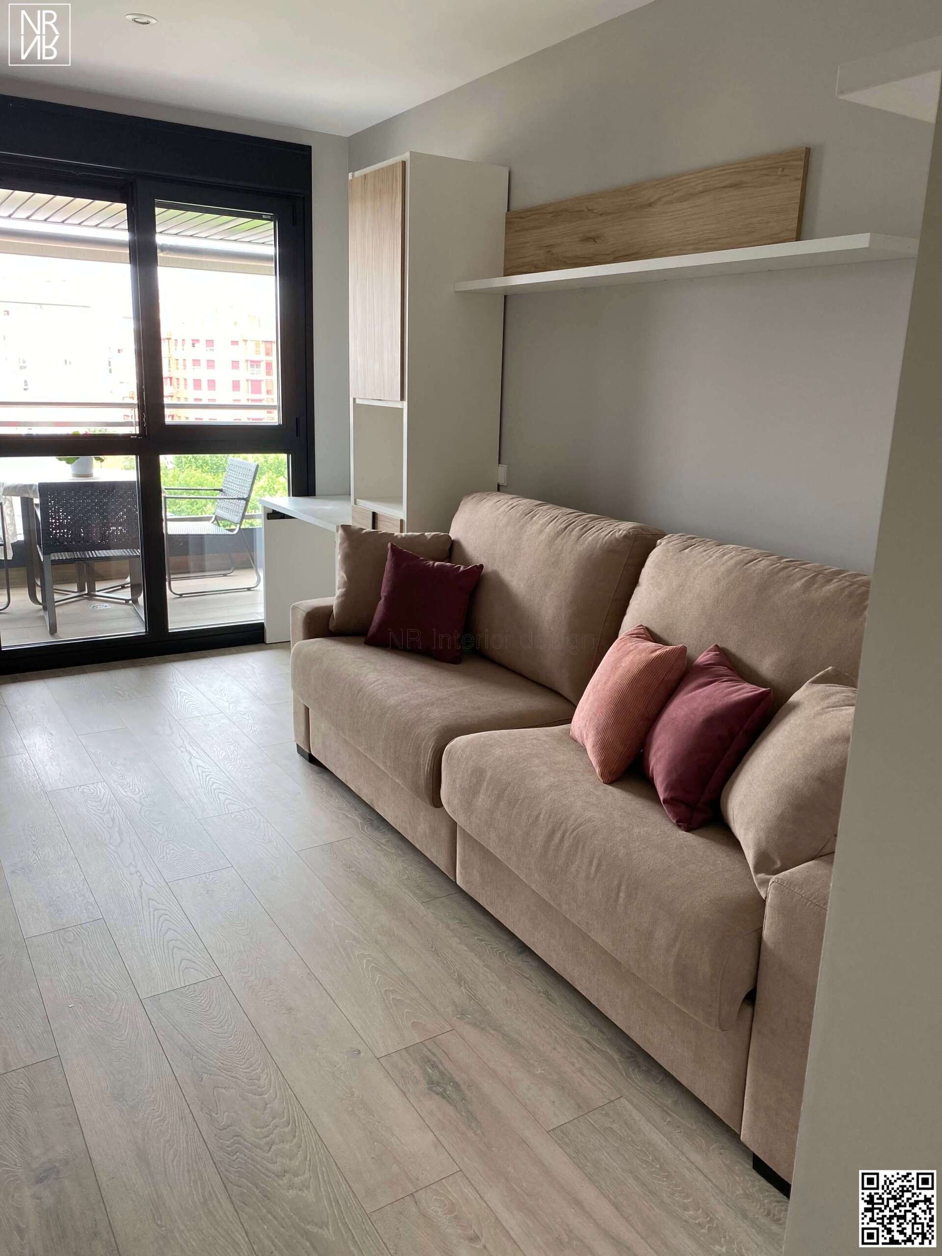 En este proyecto cabe destacar la importancia de crear una falsa puerta para tapar los cuadros de luces. Con esta creación conseguimos ampliar el espacio visual, siguiendo con la decoración implantada en las paredes, en este caso un papel tapiz con textura efecto seda.