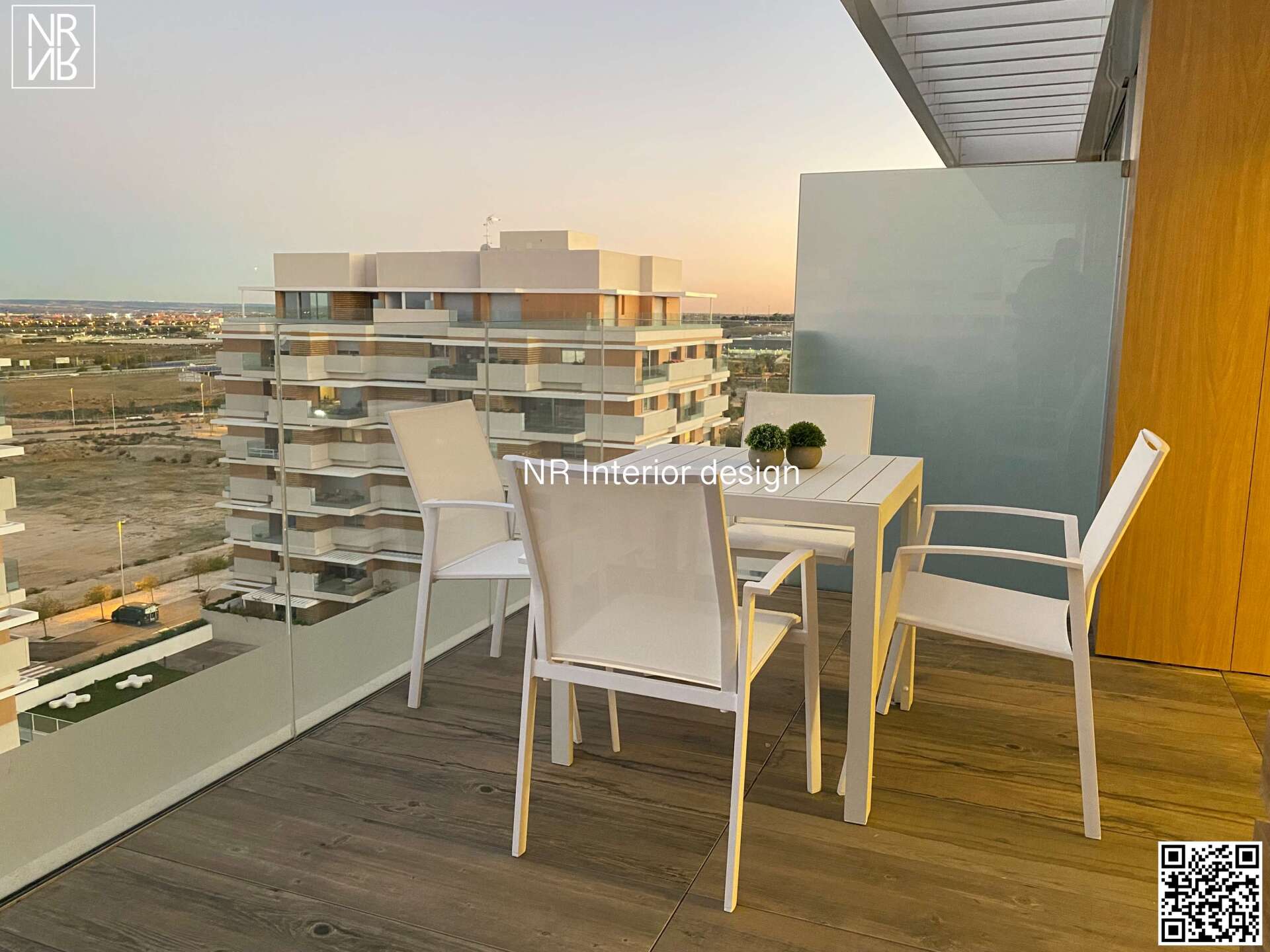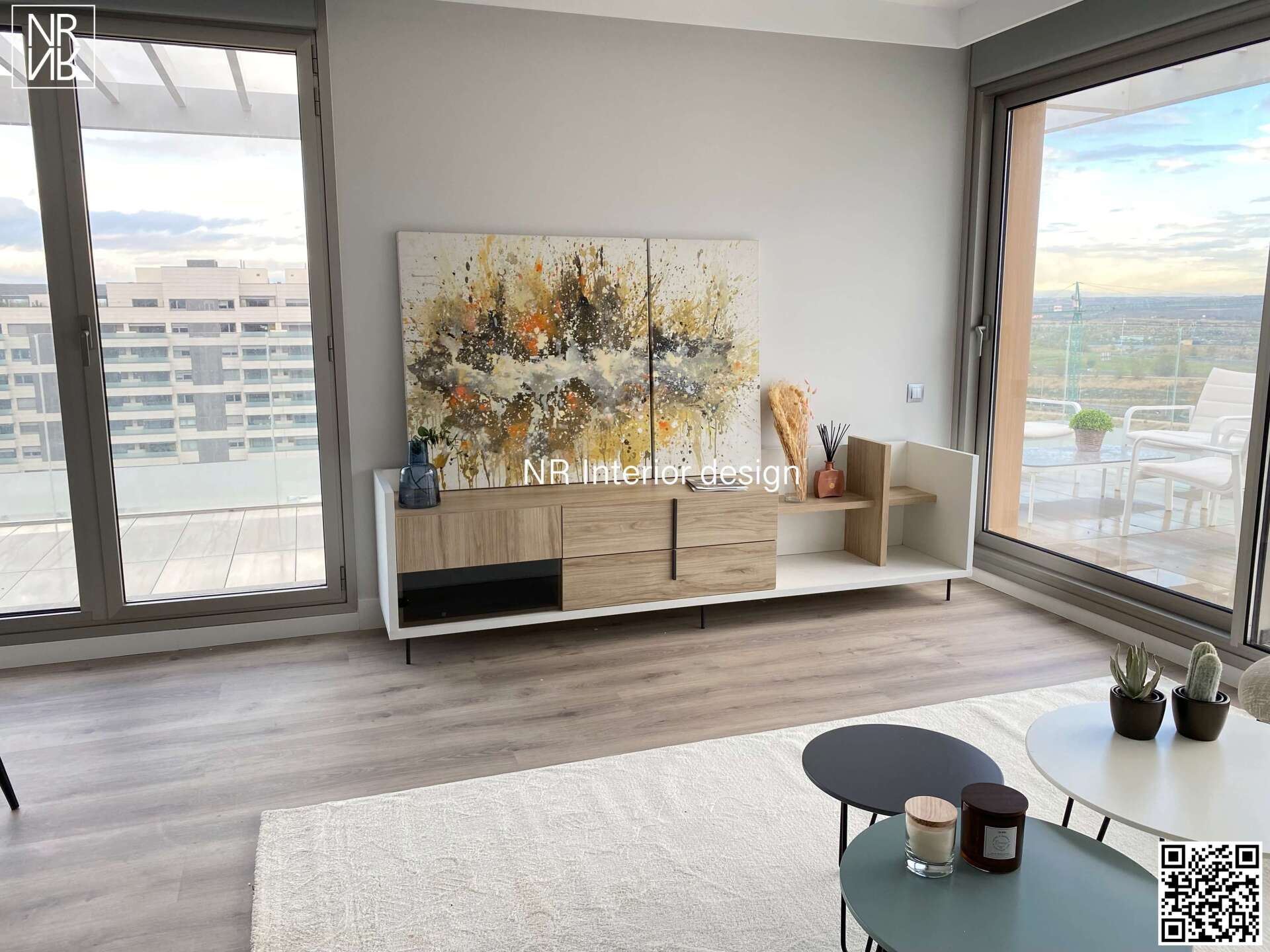 En esta fantástica oportunidad tenemos el placer de presentar un diseño especial para un ático valorado en 1M€. Nos encontramos con una distribución simétrica en proporciones con un salón cuadrangular y terraza perimetral. Se escoge una decoración basada en maderas naturales con tonos grises y notas de color proporcionadas por las espléndidas obras de arte. Para la terraza escogemos un mobiliario de diseño con acabados en aluminio epóxico blanco con tapizados hidrófugos preparados para la lluvia. El resultado es una propiedad agradable, amplia y con una terraza en donde disfrutar de los increíbles atardeceres que otorga esta zona de Madrid.