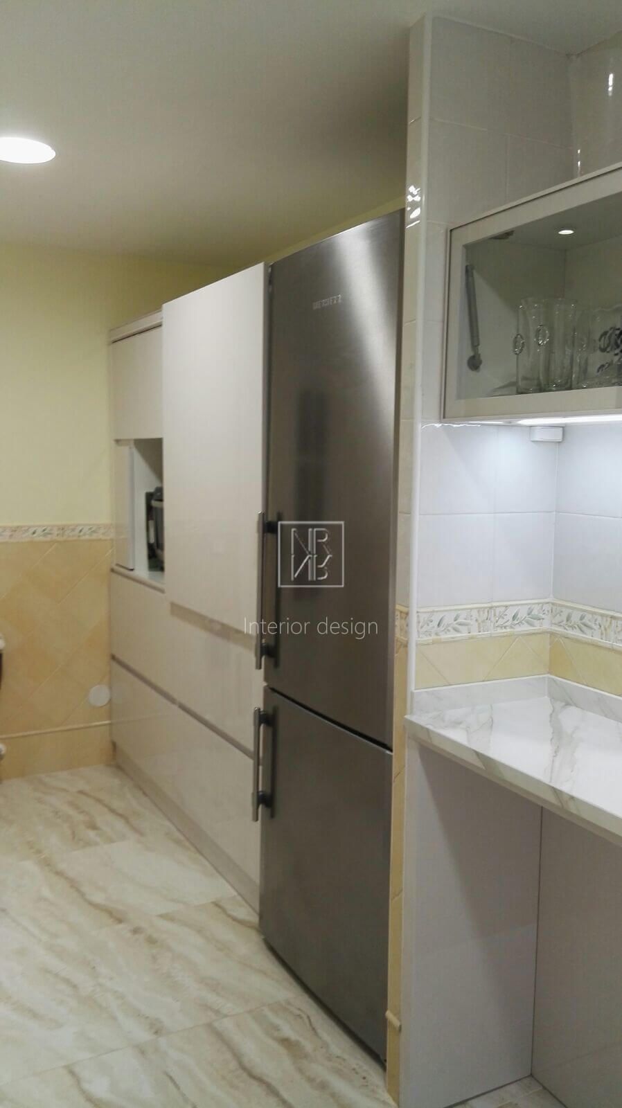 Comencem canviant la distribució dels mobles de cuina i realitzem un disseny de mobiliari en laca blanca alta brillantor per donar-li més llum i amplitud a l'espai, mentrestant es va escollir un ceràmic marbrejat per a tot el terra de la casa i es va aixecar el parquet per col·locar el terra nou. Especialment cal destacar de la cuina l'absència de tirador, així com la fabricació en exclusiva de la nostra firma amb el disseny dels mobles com el moble de porta corredissa i amb 1 calaix de fons de vidre. L'ús de materials amb última tecnologia en ferratges i el taulell de cuina li va donar aquest toc contemporani que estàvem buscant. Als dormitoris ressaltem 2 parets amb paper tapís per destacar aquestes zones i canviem el mobiliari. Com al projecte anterior, la propietària va quedar molt satisfeta amb el resultat.