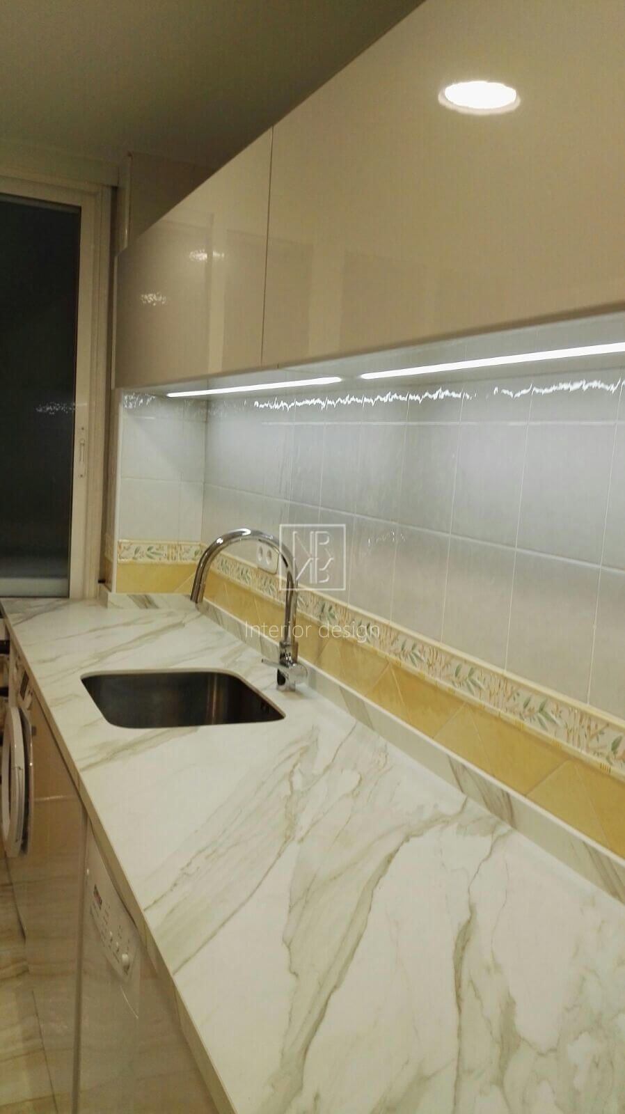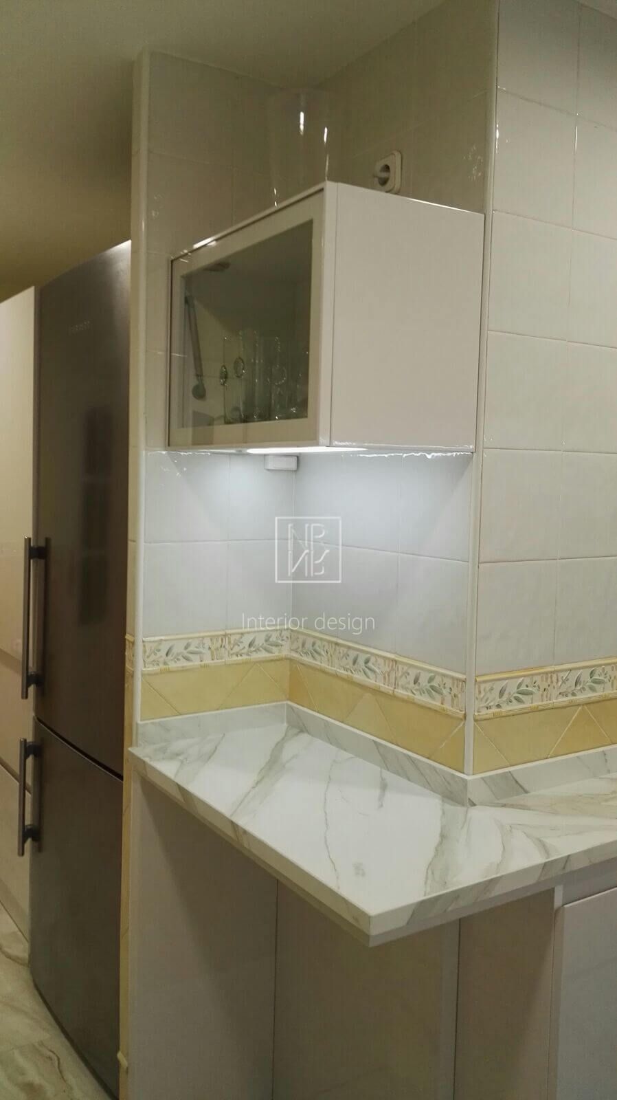 We started by changing the layout of the kitchen cabinets and designed a high-gloss white lacquer cabinet to give the space more light and spaciousness. Meanwhile, we chose marbled ceramic tile for the entire floor, and the parquet flooring was removed to install the new flooring. Particularly noteworthy in the kitchen is the absence of handles, as well as the exclusive manufacturing of our cabinetry, including the sliding-door cabinet with one glass-backed drawer. The use of state-of-the-art hardware and the kitchen countertop gave it the contemporary touch we were looking for. In the bedrooms, we highlighted two walls with wallpaper to highlight those areas and changed the cabinetry. As in the previous project, the owner was very satisfied with the result.