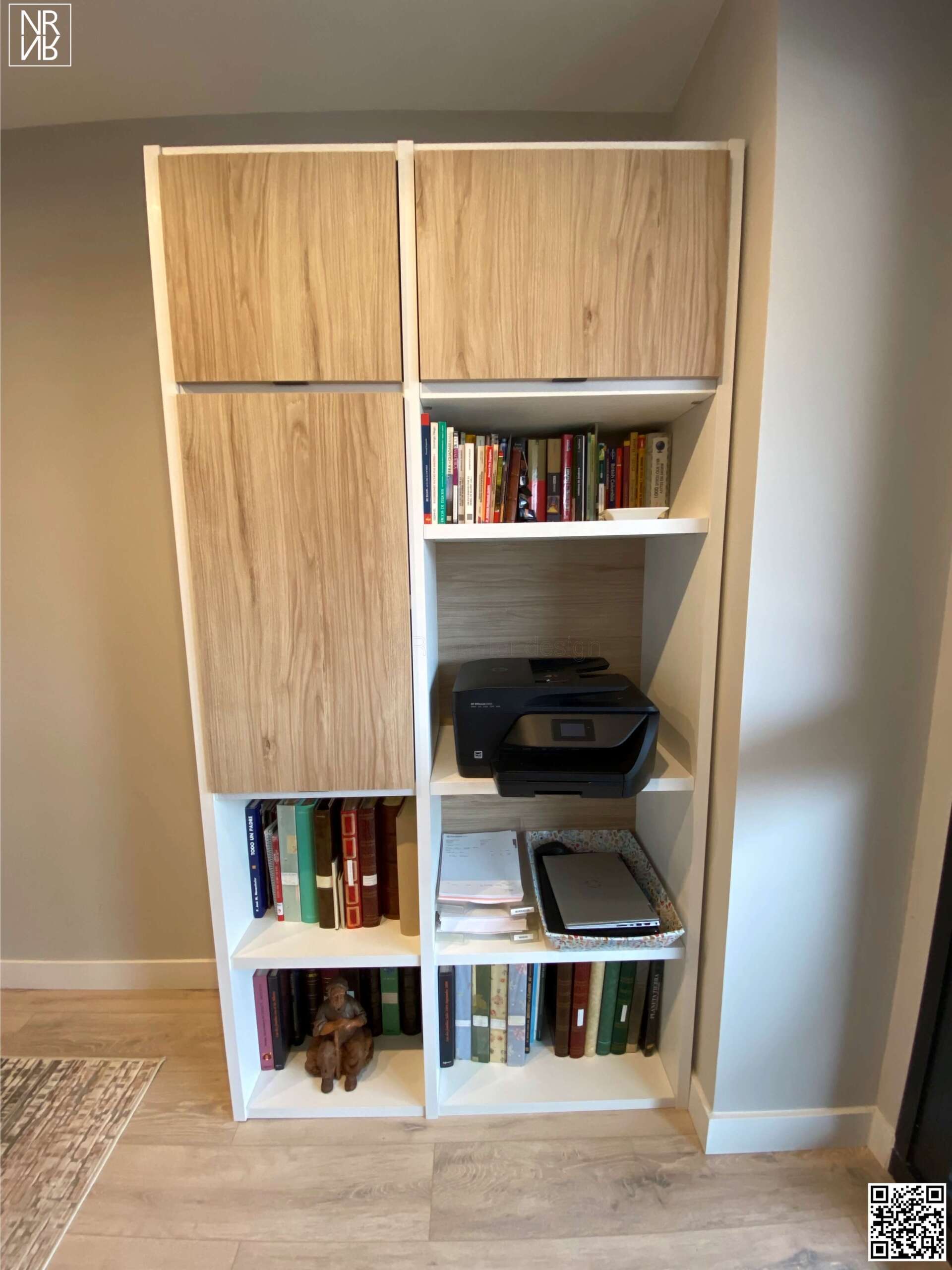Dans ce projet, il est important de souligner l'importance de créer une fausse porte pour couvrir les panneaux électriques. Avec cette création, nous avons réussi à agrandir l'espace visuel, en continuant avec la décoration mise en œuvre sur les murs, dans ce cas un papier peint texturé effet soie.