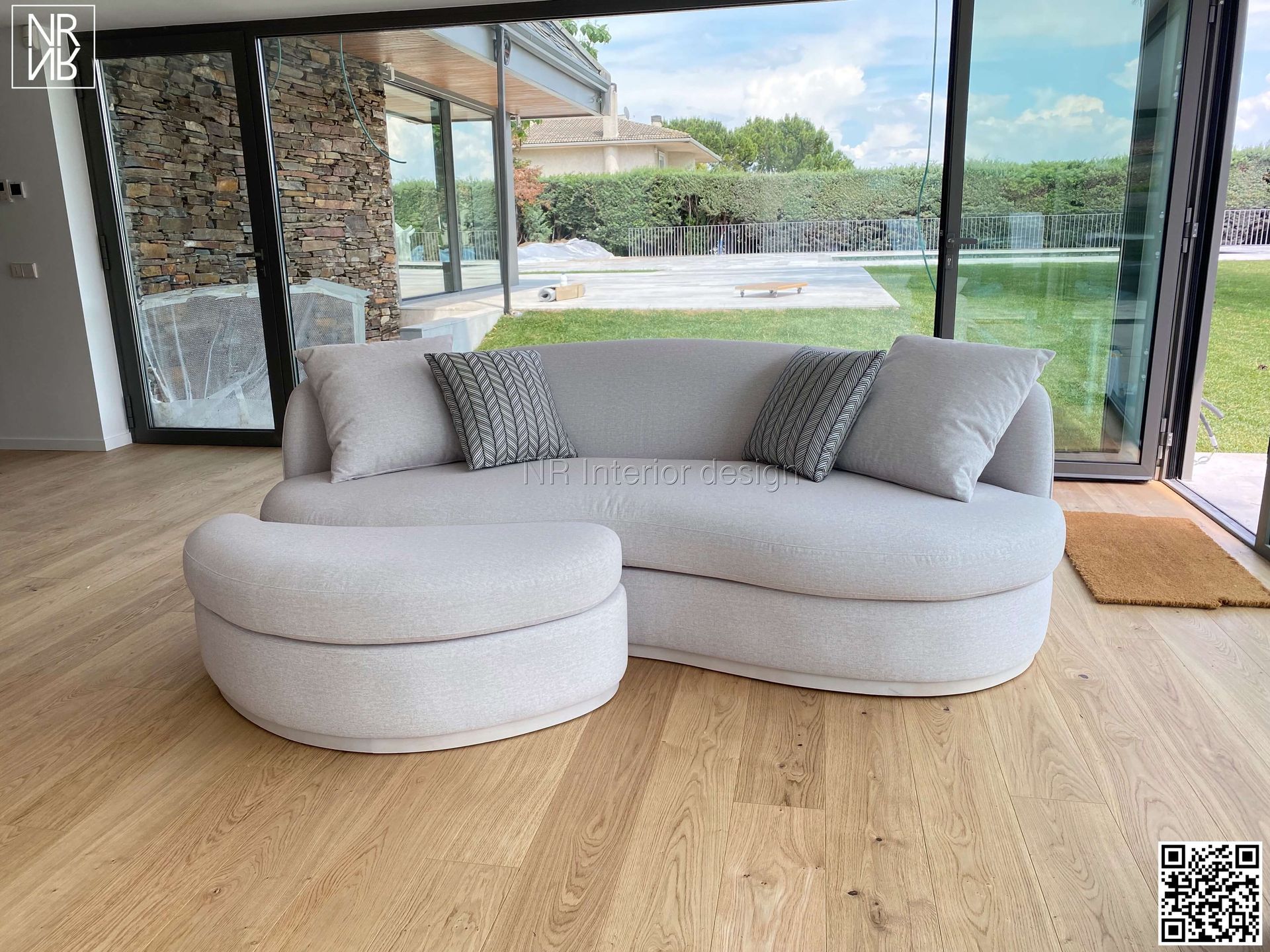 En la zona social se propusieron, rompiendo la estética tan angulosa de la propiedad, un mobiliario más redondeado y exclusivo diseñando una zona acogedora que nos da pie a las reuniones familiares.